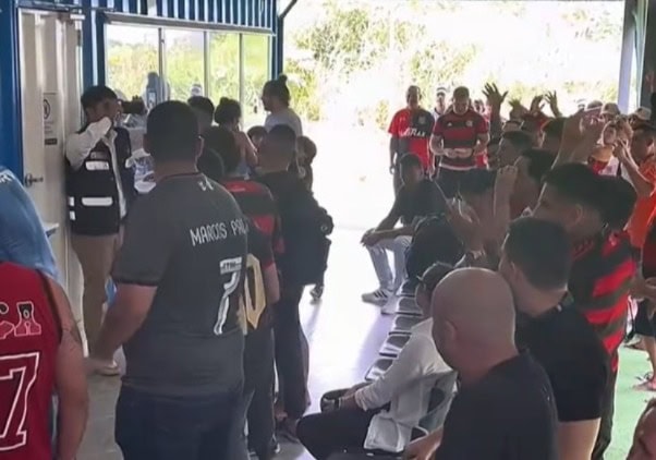 Em outro ângulos, o vídeo mostra quando o trio entra na área em que o caixa do local funciona. Um suspeito fica na porta, o segundo rende clientes, que ficam de joelhos e mãos levantas, enquanto outro criminoso retira todo o valor do caixa.