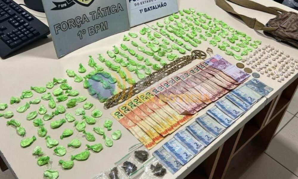 Após a identificação, constatou-se que se tratava de um adolescente de 16 anos. Durante a busca pessoal, os policiais encontraram com ele uma pochete contendo 166 trouxinhas de cocaína, 12 sacos de Skank, 72 pedras de crack e a quantia de R$ 236 em dinheiro, caracterizando a prática de tráfico de drogas.