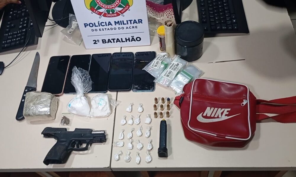 Leandro da Silva Rodrigues, de 24 anos, Railan Saraiva da Silva, de 22, e Gleyson Santos da Silva, de 25, foram presos na noite desta segunda-feira (28) durante uma operação da Polícia Militar no ramal Vietnã 1, no bairro Vila Acre, segundo distrito de Rio Branco. O trio foi detido por porte ilegal de arma de fogo de uso restrito, tráfico de drogas e associação criminosa.