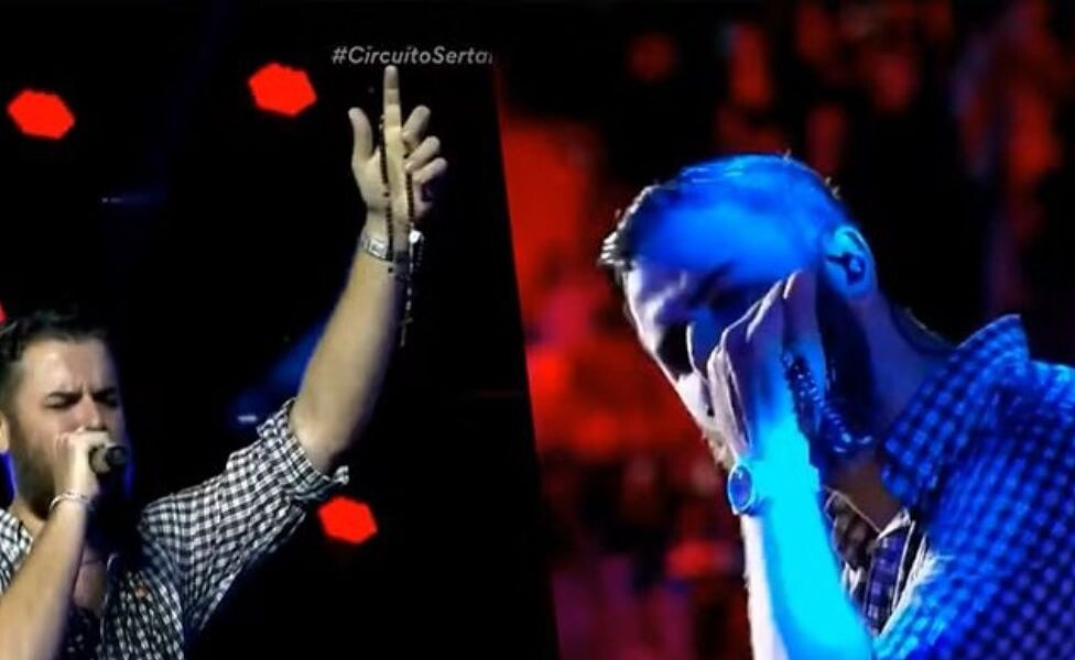 A dupla cantava “Deu Moral”, um dos grandes sucessos da carreira, quando Zé Neto ganhou o objeto religioso. Ele deu um beijo no terço e o ergueu para cima, demonstrando que ficou mexido com o presente.