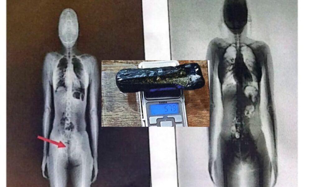 A mulher foi submetida à visualização corporal através do aparelho Body Scan e a imagem capturada indicou “anomalias” na região pélvica dela aparentando haver um corpo estranho na visitante.