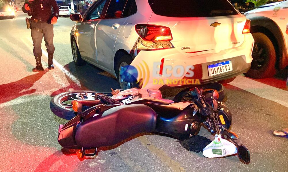 Um acidente envolvendo três veículos deixou duas pessoas feridas na noite desta sexta-feira (9), na rua Rio de Janeiro, no bairro Floresta, em Rio Branco. As vítimas são pai e filho, que estavam em uma motocicleta no momento da colisão.