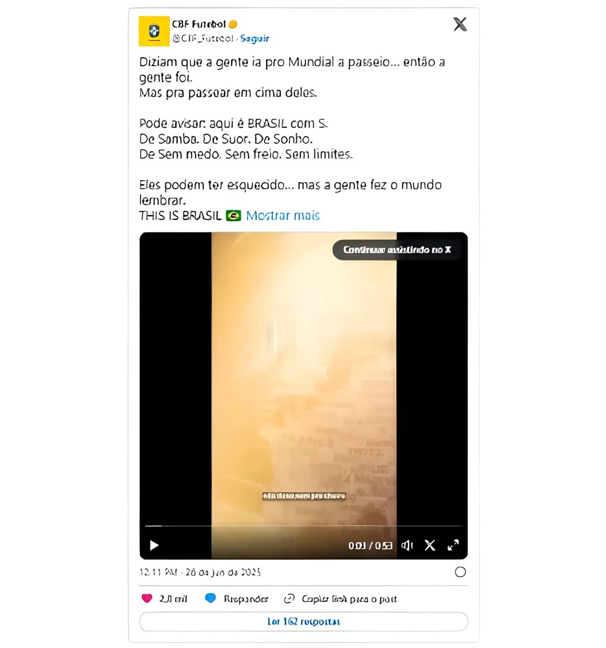 A CBF (Confederação Brasileira de Futebol) divulgou um vídeo nesta quinta-feira (26) sobre o bom desempenho dos brasileiros na Copa do Mundo de Clubes.