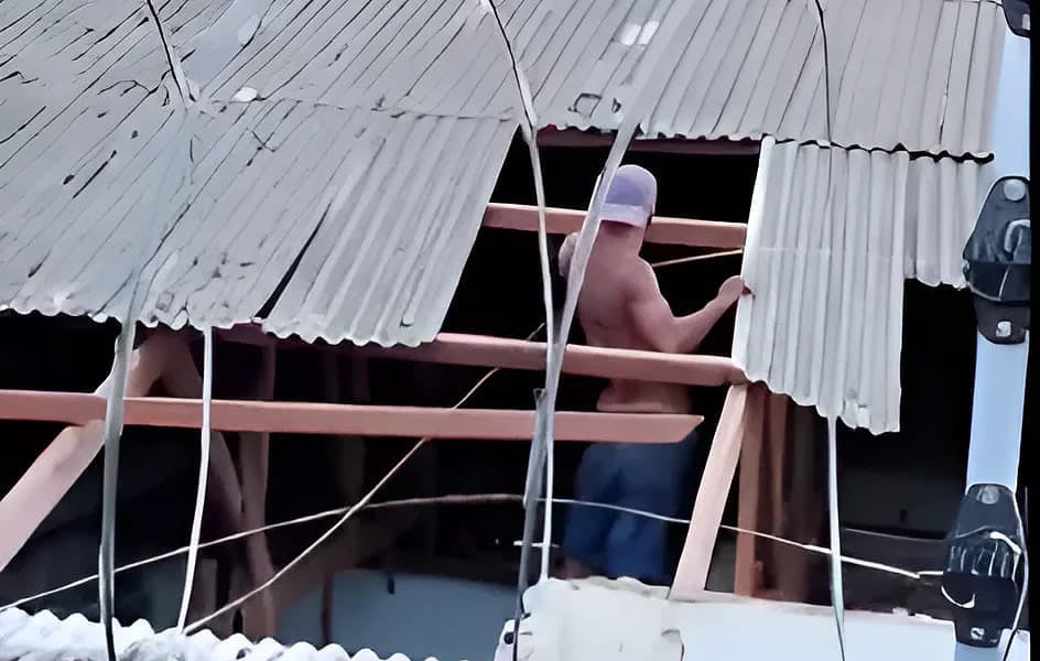 Um dos homens que aparece nas imagens usa tornozeleira eletrônica, indicando que está sob medida judicial. Ele atua na remoção das estruturas do telhado, enquanto outras pessoas acompanham e ajudam na ação.