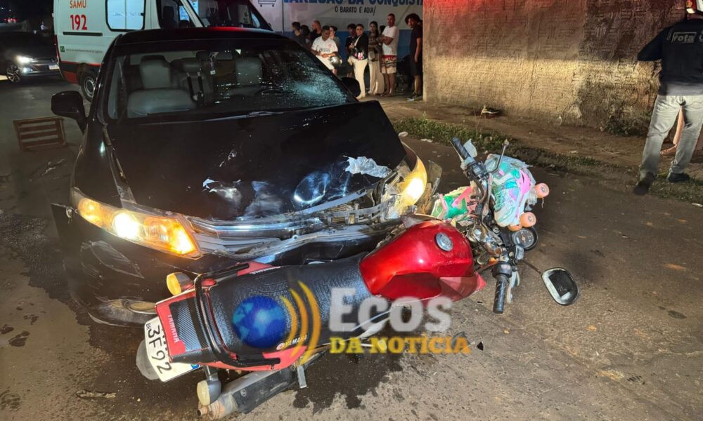 O motociclista Juvenil Gomes Leite, de 49 anos, a esposa Michelle e uma criança de 8 anos ficaram feridos após um acidente ocorrido na noite deste sábado (21), no cruzamento da Rua Fonte Nova com a Rua Padre Cícero, no bairro Conquista, em Rio Branco.