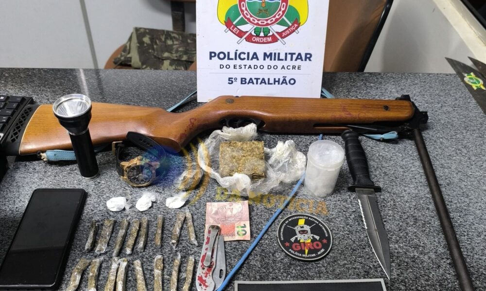 Durante a varredura no local, os militares encontraram um rifle artesanal adaptado para calibre .22, munições, uma gandola camuflada e uma grande quantidade de entorpecentes já prontos para a comercialização.