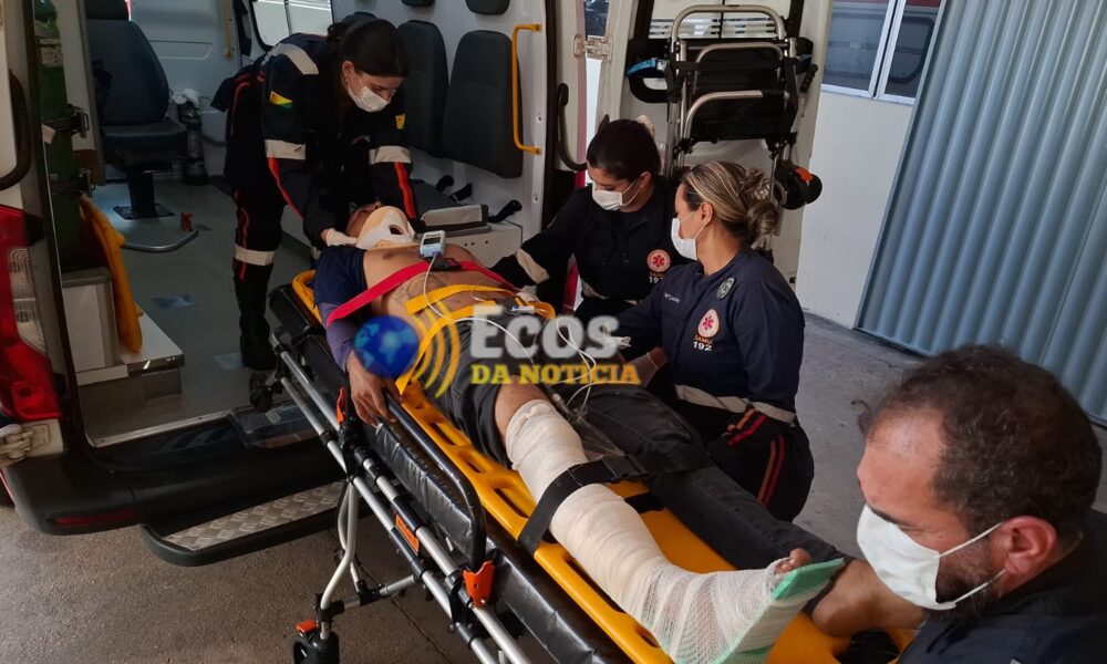 Com o impacto, o motociclista sofreu uma fratura exposta na perna esquerda.