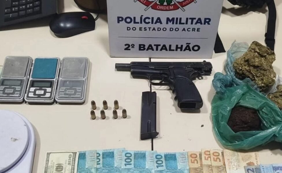 A Polícia Militar do Acre (PMAC) prendeu por intermédio do grupamento tático do 2° Batalhão, um indivíduo por porte ilegal de arma de fogo e tráfico de drogas, na noite desta sexta-feira, 25, o mesmo ainda é suspeito de praticar um homicídio em 2023 no bairro Taquari. Toda a ocorrência foi na travessa Lima, no ramal Bom Jesus, na Vila Acre.