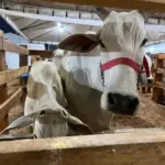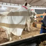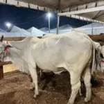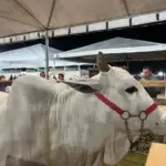 Uma vaca nelore branca de nome Maré, que está exposta na Expoacre Juruá, em Cruzeiro do Sul, custa R$ 150 mil. O bezerro dela vale R$ 15 mil.