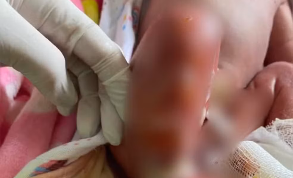 A menina passou pelo método cirúrgico nos pés no último dia 9 de julho. Apesar da melhora, o quadro da bebê ainda é delicado e os médicos não descartam a possibilidade de amputação de alguns dedos.