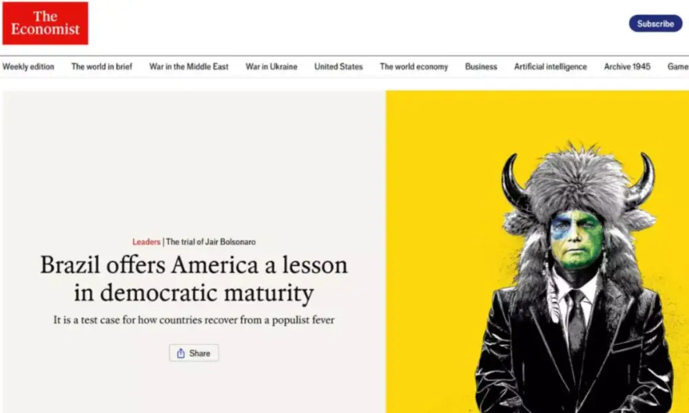 A reportagem de capa da The Economist destaca o início do julgamento de Jair Bolsonaro e aliados próximos na próxima terça-feira, 2 de setembro, por tentativa de golpe de Estado após as eleições de 2022.