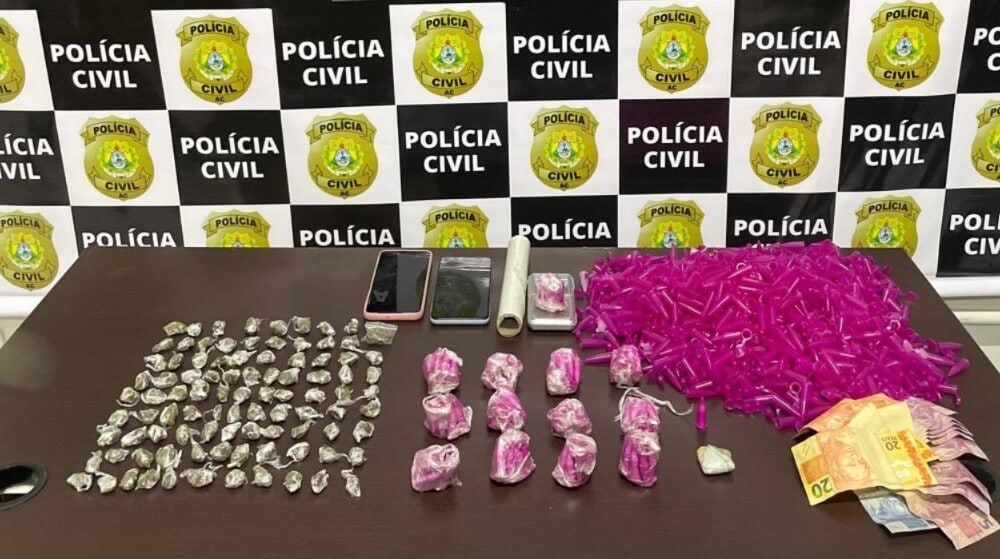 Durante o cumprimento do mandado em uma residência localizada no Bairro Wilson Ribeiro, em Rio Branco, o foragido não foi encontrado, mas as equipes apreenderam uma quantidade relevante de drogas com uma pessoa associada a ele. Foram recolhidos 130 pinos contendo material preliminarmente identificado como cocaína (230g), 93 papelotes de maconha (100g), uma porção de crack, além de balanças de precisão e material para embalo de entorpecentes.
