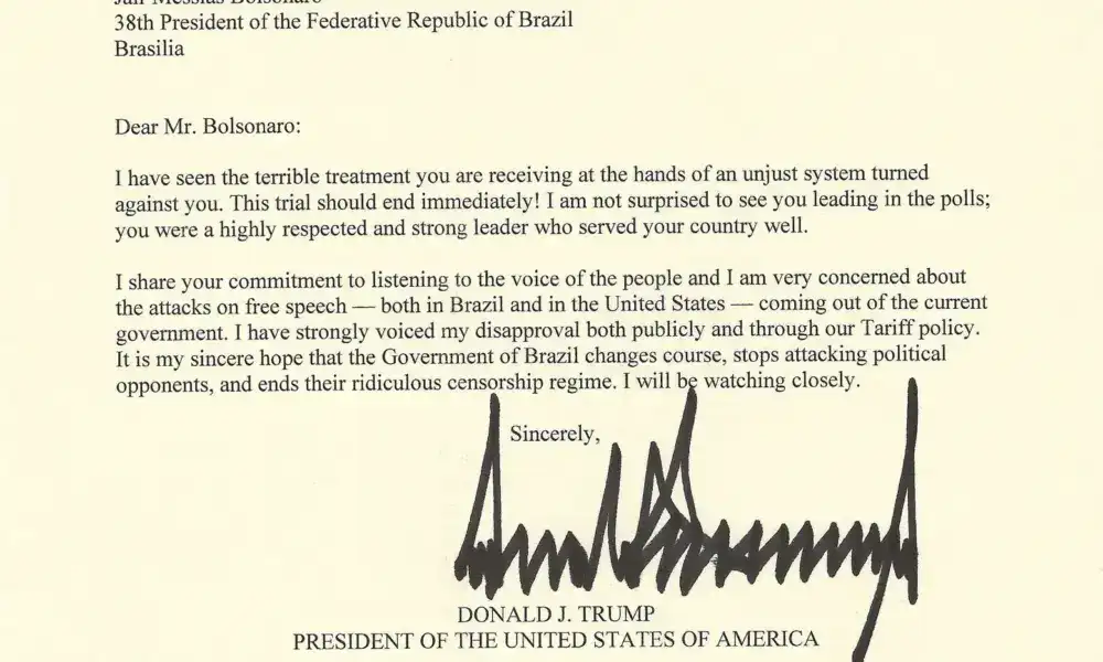 Na mensagem datada de 17 de julho e escrita em papel timbrado da Casa Branca, Trump afirma ter testemunhado o que chama de “tratamento terrível” contra Bolsonaro e classifica o sistema judicial brasileiro como “injusto”.