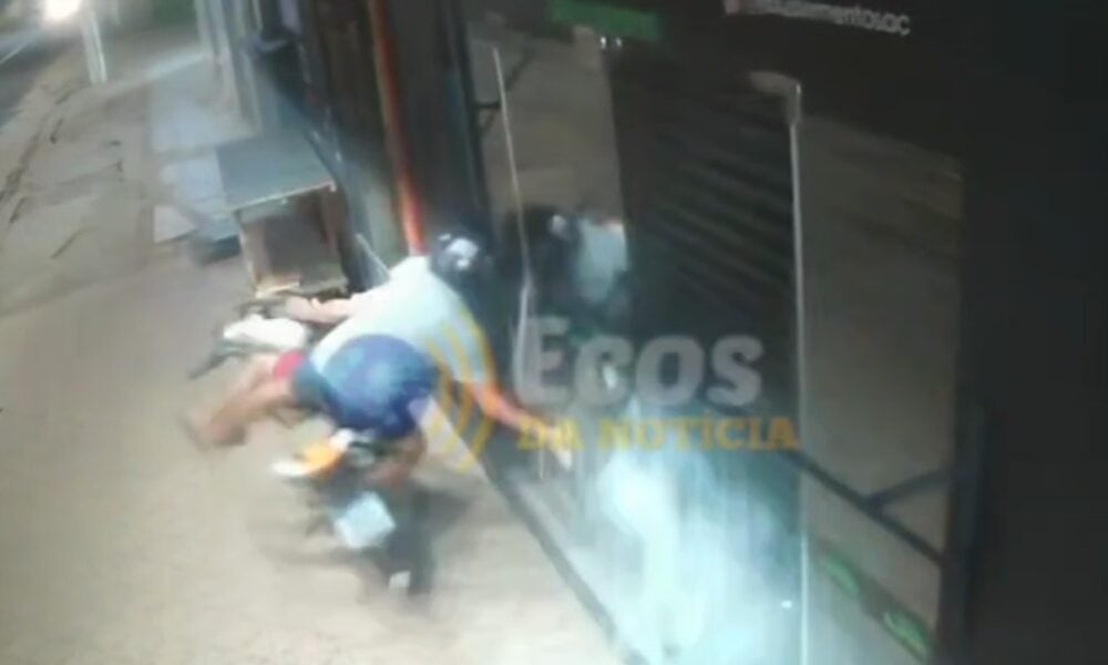 Segundo informações, o condutor da motocicleta perdeu o controle do veículo e acabou colidindo contra a porta de vidro da loja J.A Suplementos, provocando um forte impacto que resultou em danos significativos ao estabelecimento. O prejuízo estimado é de aproximadamente R$ 2 mil.