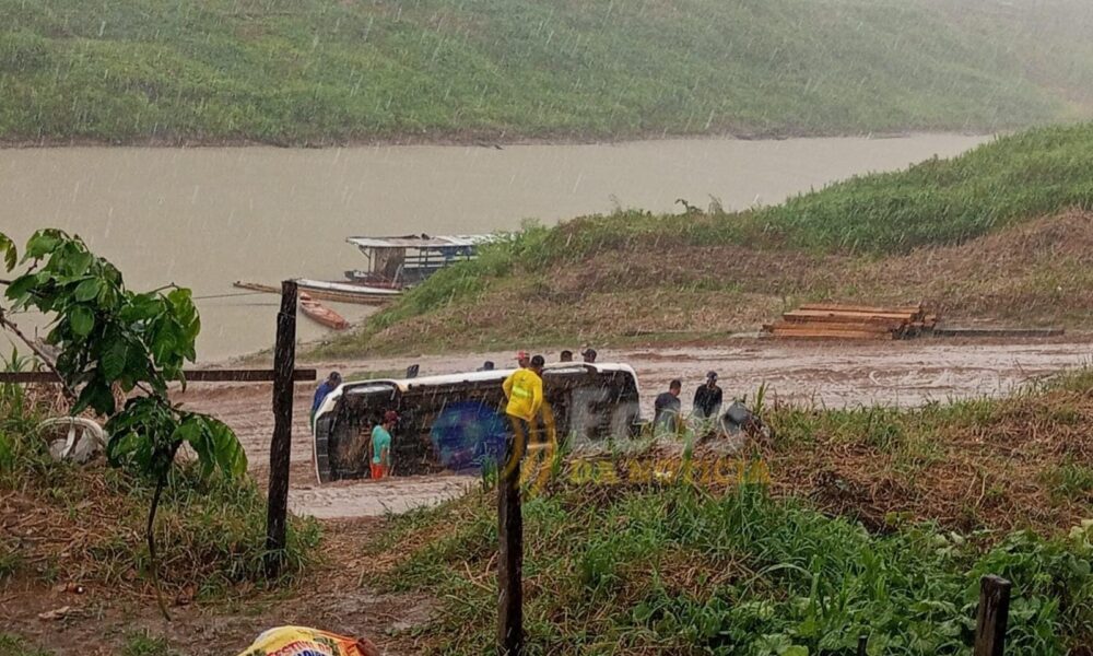 Na tarde desta quinta-feira (4), um acidente chamou a atenção de moradores de Sena Madureira. Uma caminhonete tombou na região da Praia do Amarilho logo após o início de uma chuva que atingiu a cidade.