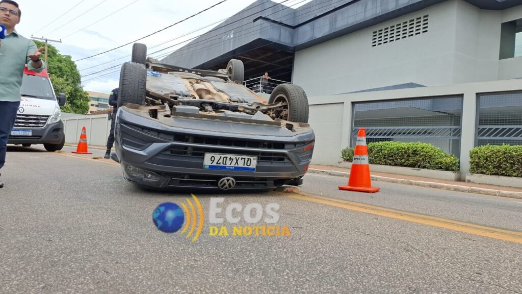 Com o impacto, o Virtus capotou e ainda atingiu um terceiro automóvel, um Volkswagen Gol cinza, de placa QLX-6G78, também estacionado no local.