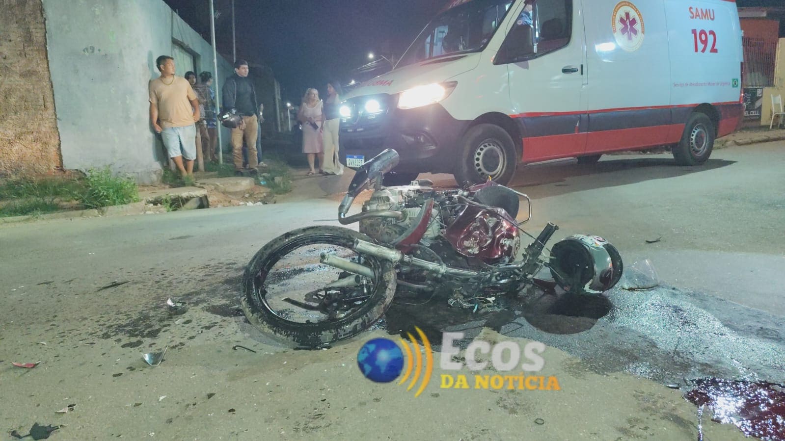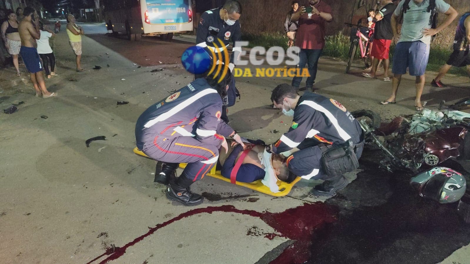 Um acidente de trânsito envolvendo uma motocicleta e um ônibus da empresa Ricco deixou o motociclista Ray Silva da Costa, de 20 anos, gravemente ferido na noite desta quarta-feira (22), no cruzamento das ruas Laranja e Ingá, no bairro Mocinha Magalhães, em Rio Branco.