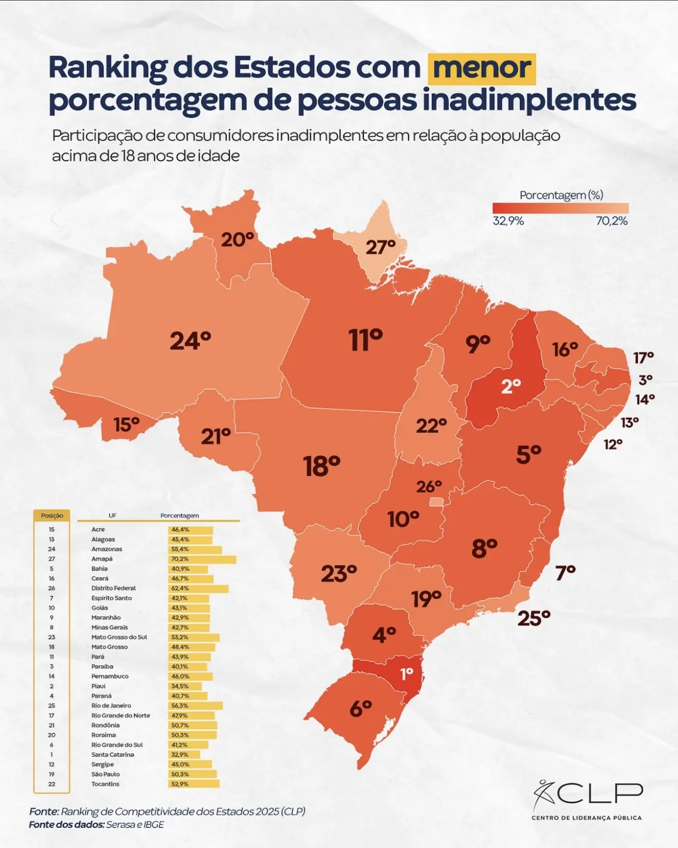 No topo do ranking, Santa Catarina aparece como o estado com o menor percentual de inadimplentes do país, registrando 32,9% da população adulta com dívidas em atraso.