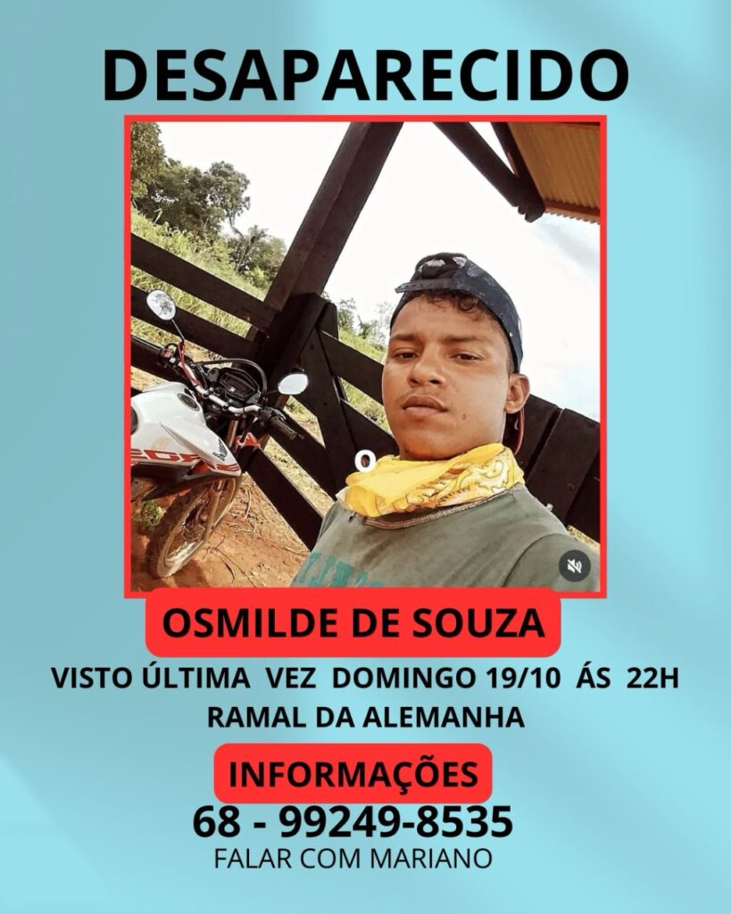 De acordo com informações da família, Osmilde seguia para a Comunidade Alemanha, localizada a poucos quilômetros de Epitaciolândia, com acesso pela BR-317. Desde então, ele não fez mais contato e não retornou para casa, gerando grande preocupação entre parentes e amigos.