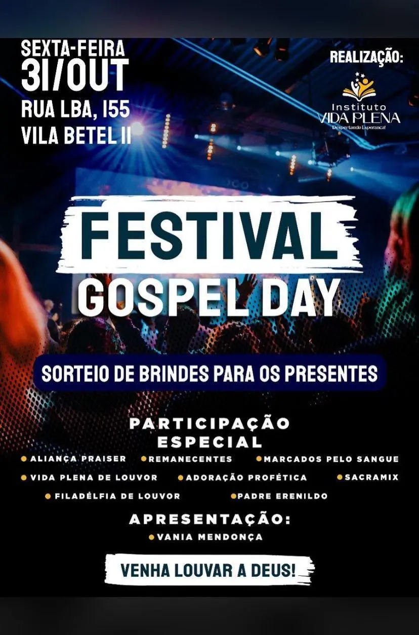 Hoje, às 19h, a Vila Betel será palco de uma grande celebração de fé, arte e comunhão cristã: o Festival Gospel Day. Promovido pelo Instituto Vida Plena, o evento promete reunir centenas de pessoas em uma noite inesquecível de adoração, música e união entre igrejas evangélicas e católicas na rua LBA, número 155.