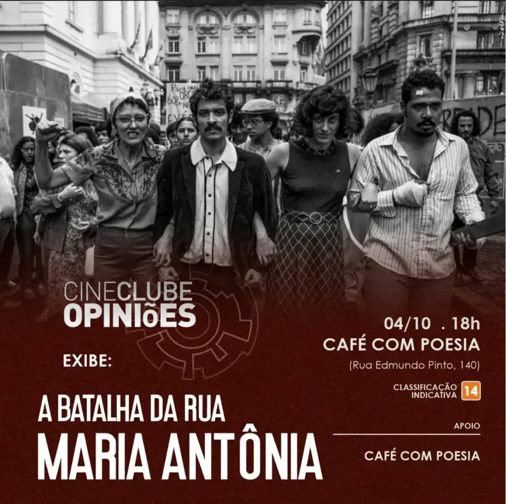 O Cineclube Opiniões, em parceria com o projeto Café com Poesia, realiza neste sábado, 4 de outubro, mais uma sessão especial de cinema. O filme exibido será “Batalha da Rua Maria Antônia”, produção que revisita um dos episódios mais marcantes da história recente do Brasil, ocorrido em 1968, quando estudantes da Universidade de São Paulo (USP) e da Universidade Mackenzie se enfrentaram em violentos confrontos.