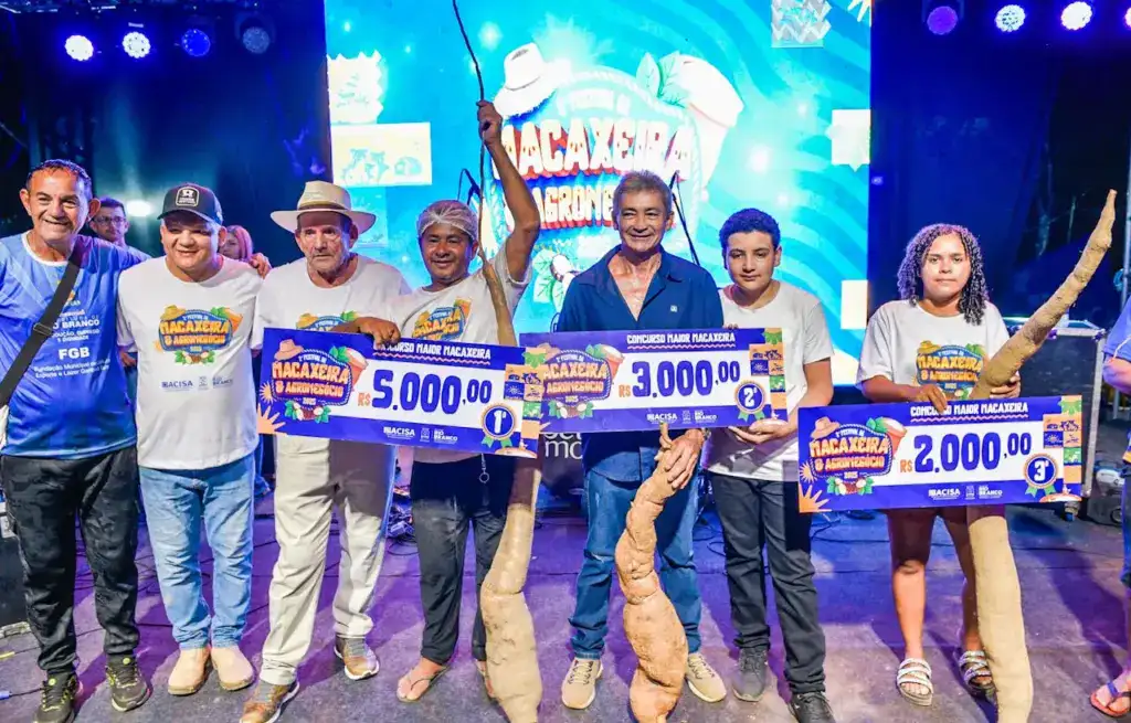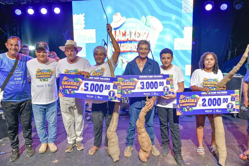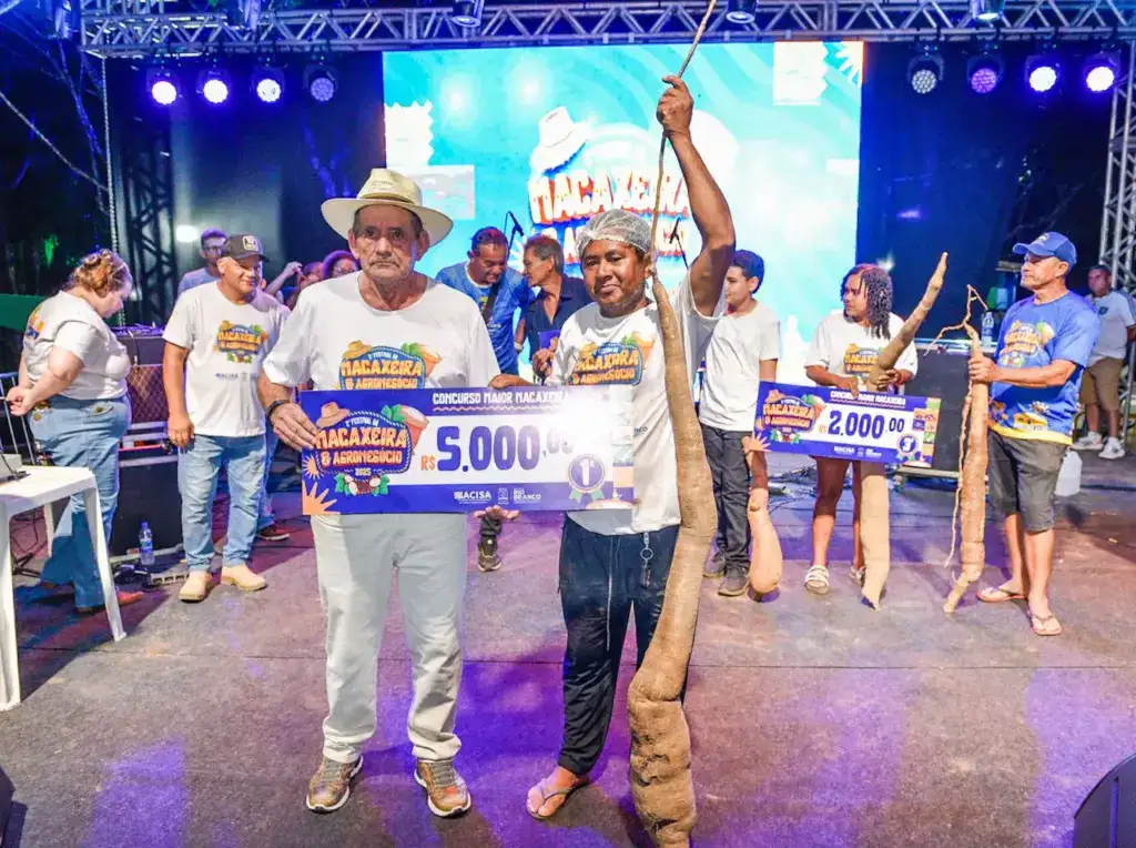 O produtor José Ferreira, conhecido como Ferreirinha, levou na noite deste sábado, 04, na segunda edição do Festival da Macaxeira, em Rio Branco, pelo segundo ano consecutivo, o título de produtor da maior e mais pesada macaxeira da competição, com 11,16 quilos e cerca de 3,04 metros.