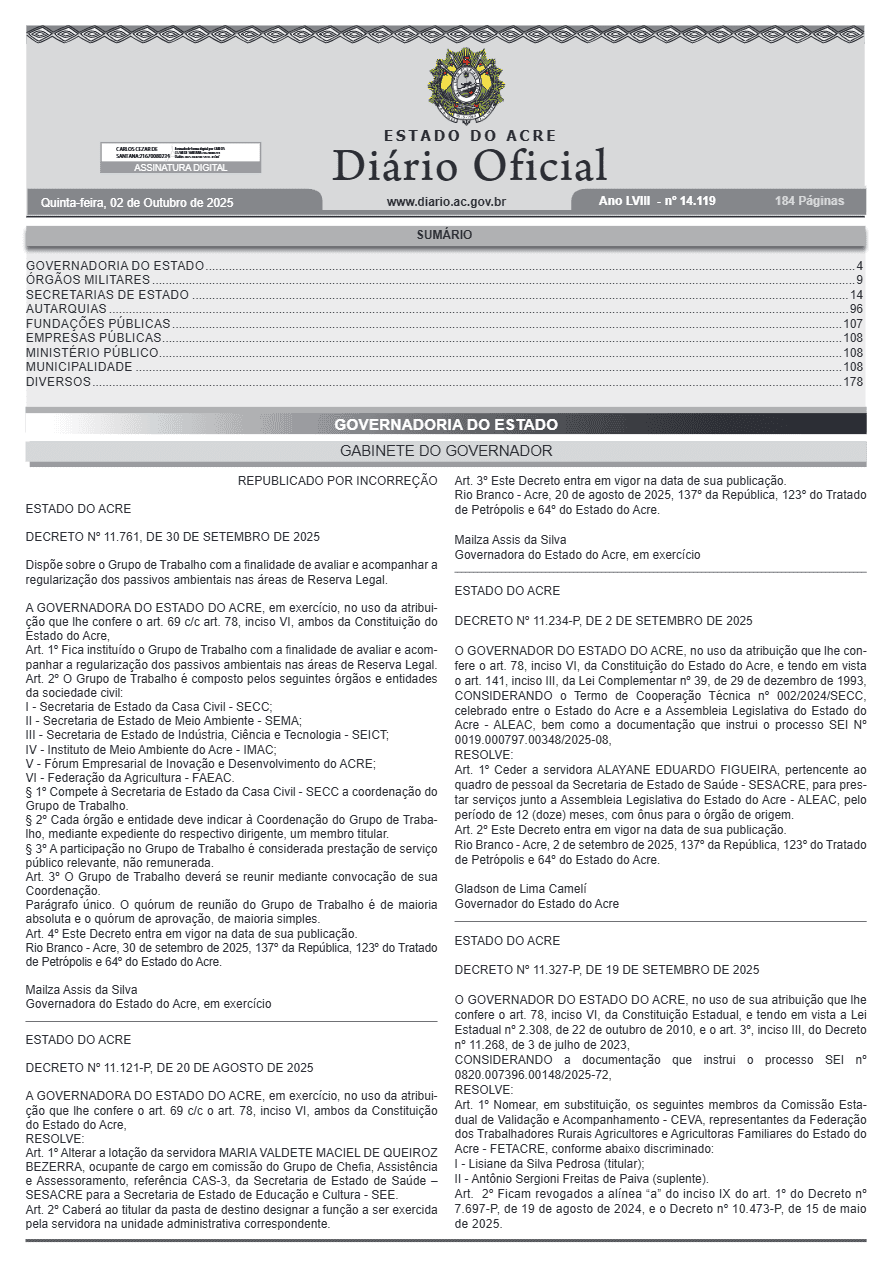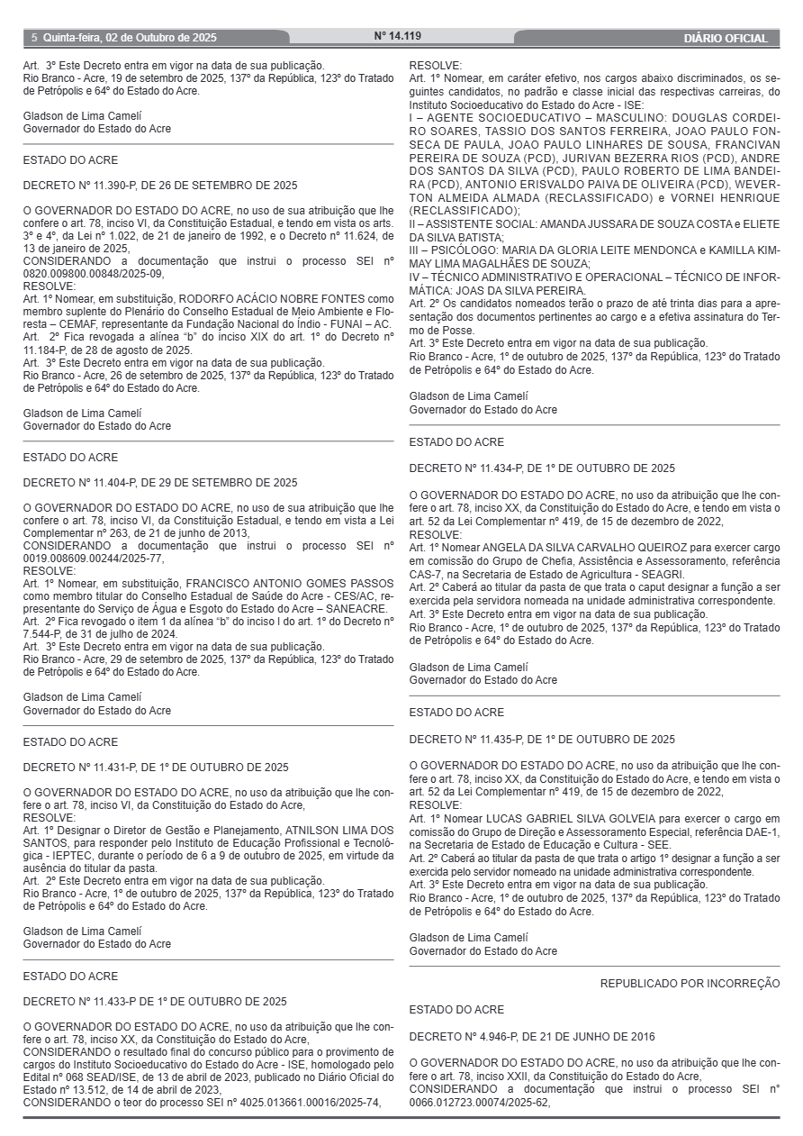 O governador Gladson Cameli (Progressistas) assinou nesta quinta-feira, 02, o Decreto nº 11.433-P, nomeando candidatos aprovados no concurso público do Instituto Socioeducativo do Estado do Acre (ISE). O certame, homologado em abril de 2023, abriu vagas para diferentes áreas da instituição, responsável pela execução da política socioeducativa no estado.