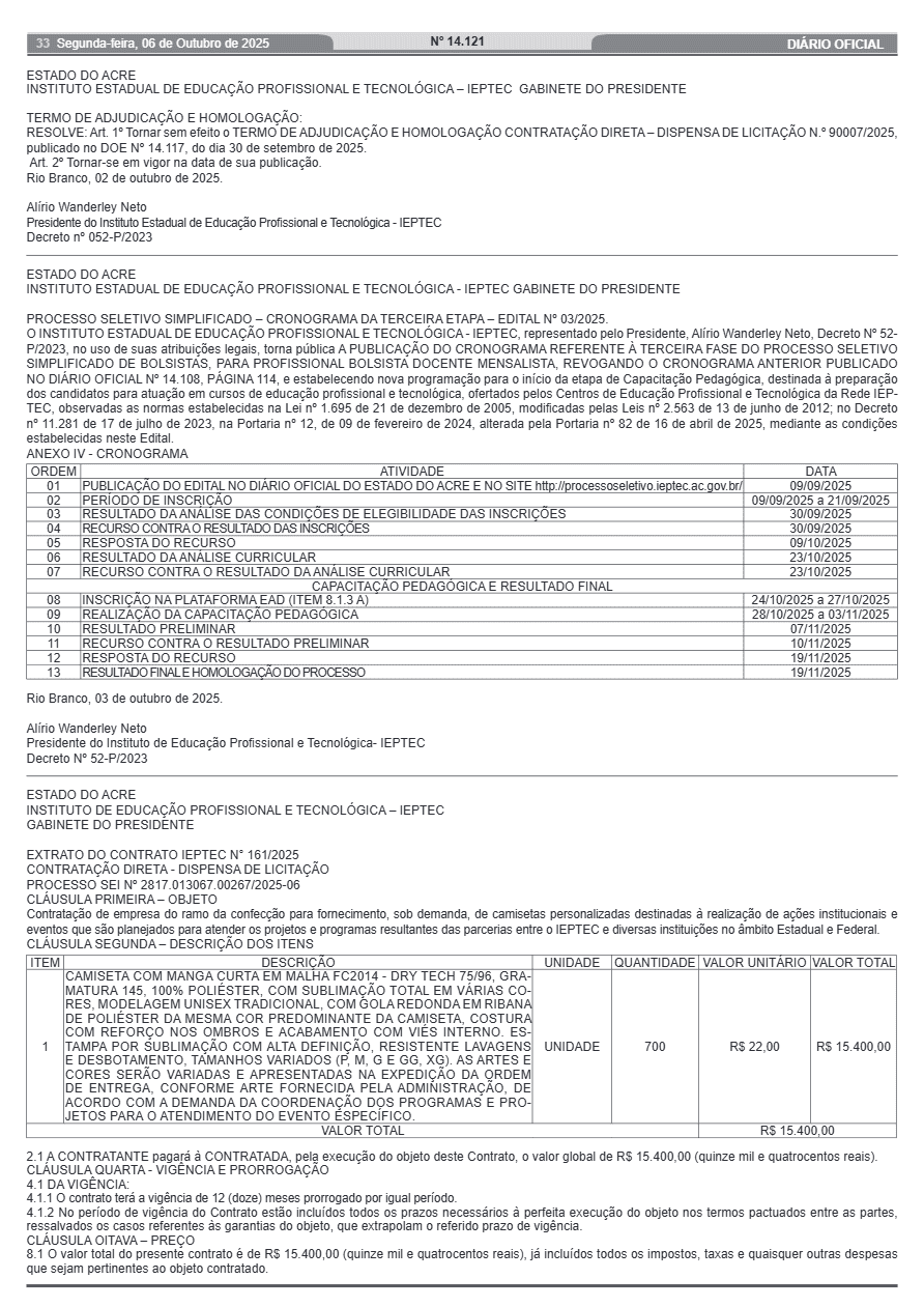 O Instituto Estadual de Educação Profissional e Tecnológica do Acre (Ieptec) publicou no Diário Oficial do Estado desta segunda-feira, 06, a convocação de candidata aprovada no seletivo simplificado, edital nº 08/2024, voltado à formação de cadastro reserva de profissionais bolsistas não docentes mensalistas.