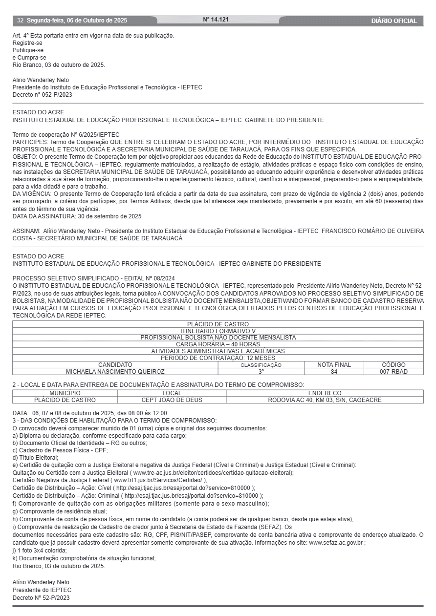 A candidata Michaela Nascimento Queiroz, classificada em 3º lugar com nota 84, foi convocada para atuar nas atividades administrativas e acadêmicas do Centro de Educação Profissional e Tecnológica (CEPT) João de Deus, localizado em Plácido de Castro, no Itinerário Formativo V. O contrato terá duração de 12 meses, com carga horária de 40 horas semanais.