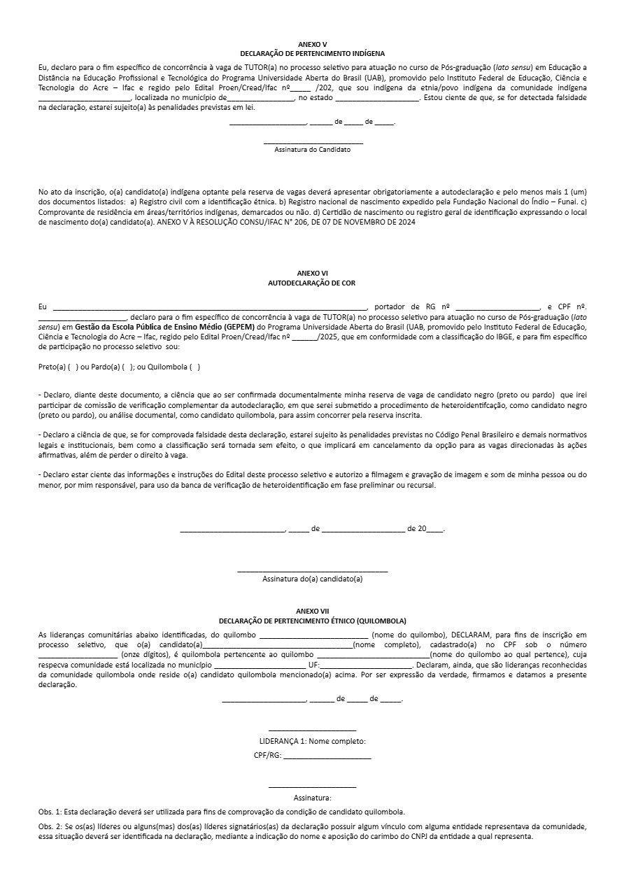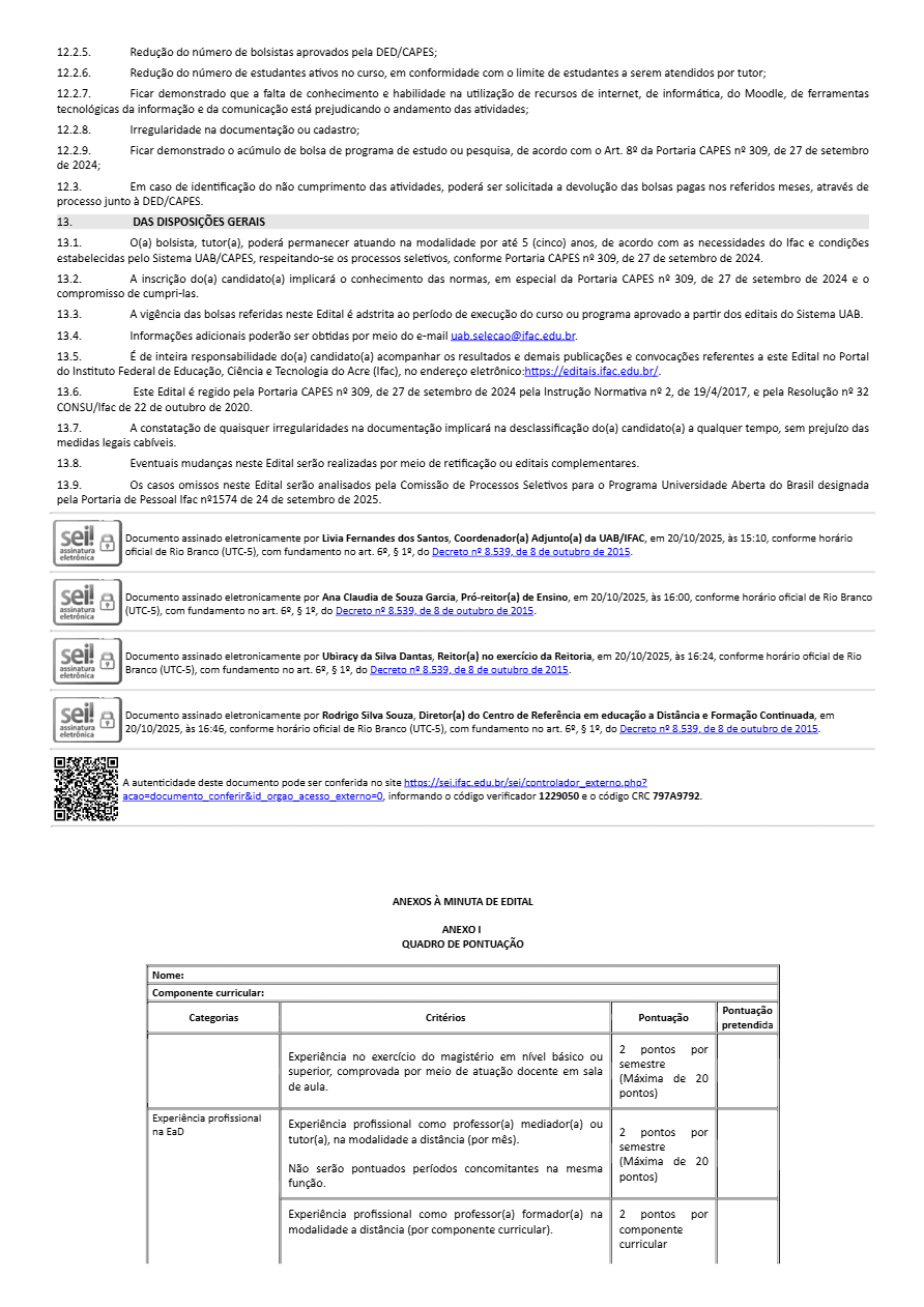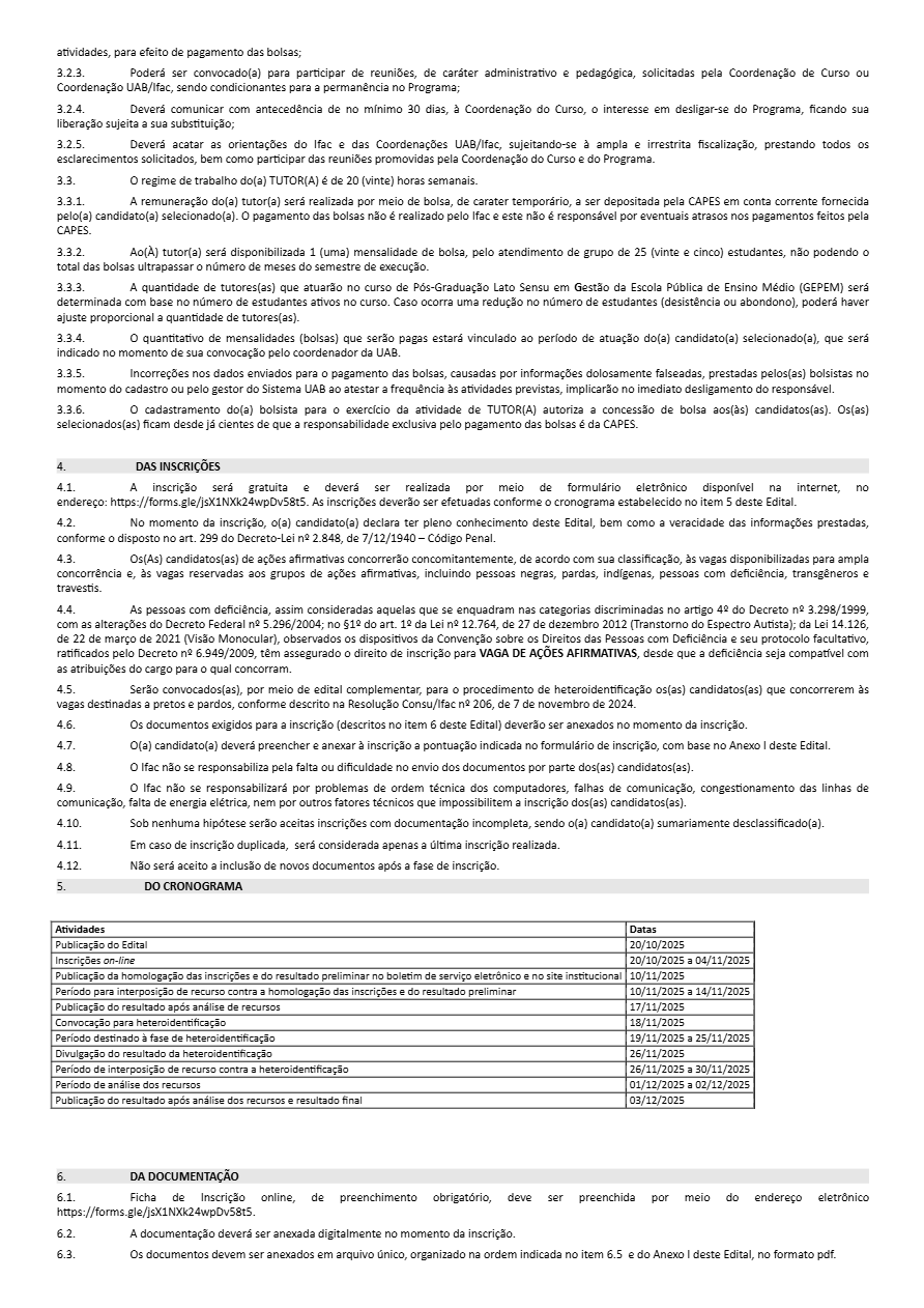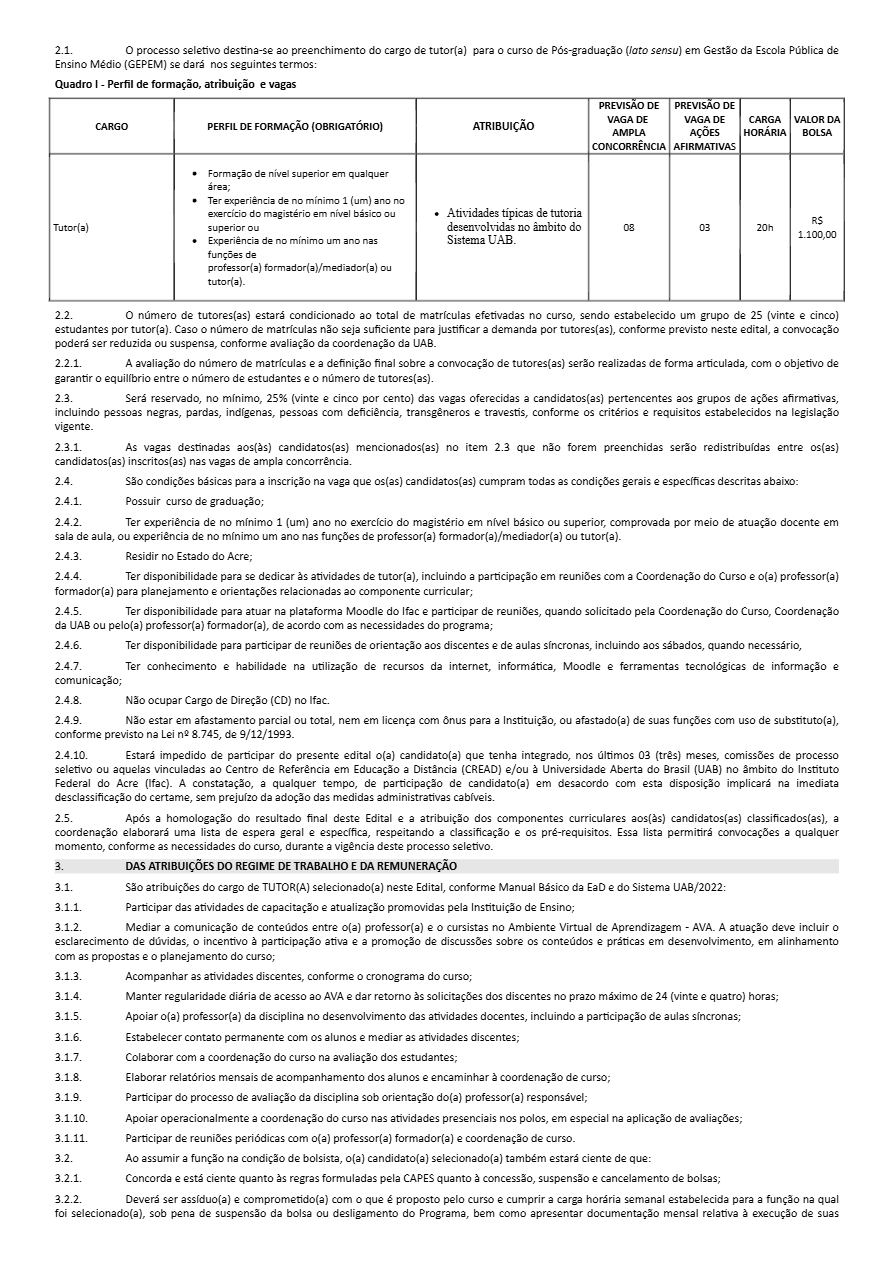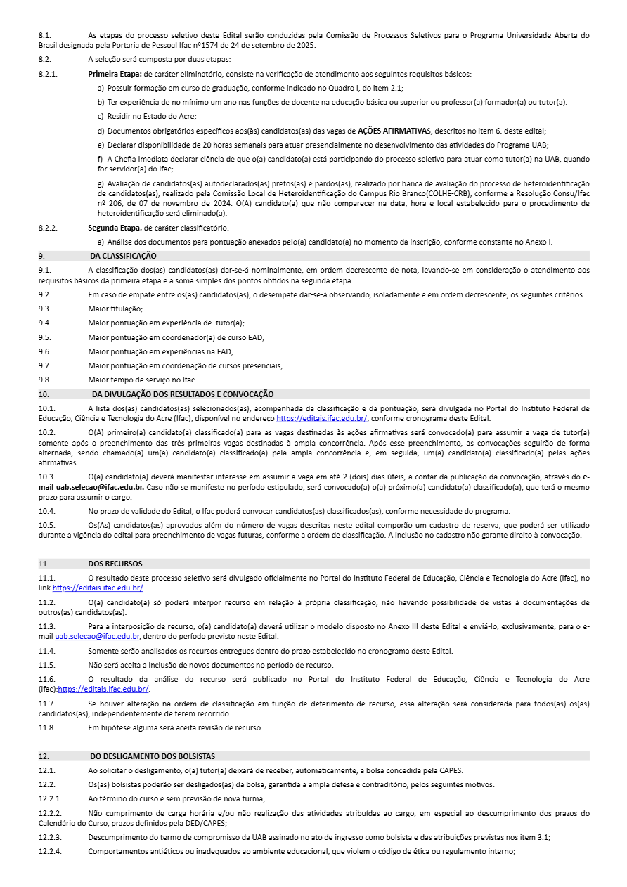 De acordo com o edital, o vínculo é temporário e não gera relação empregatícia com o Ifac, sendo a bolsa paga diretamente pela Capes, conforme a disponibilidade orçamentária do Sistema UAB. Mais informações podem ser obtidas pelo e-mail uab.selecao@ifac.edu.br.