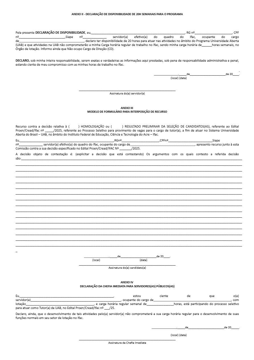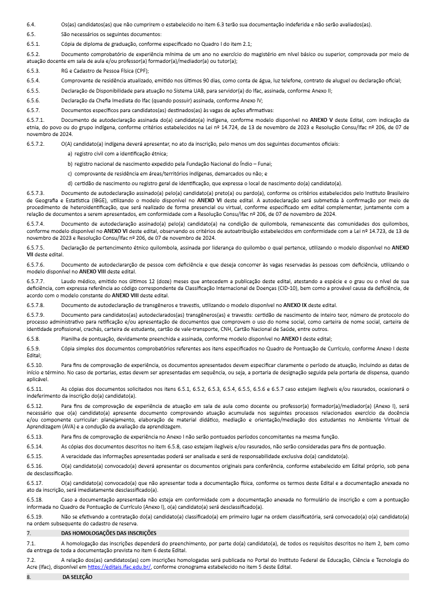 A homologação das inscrições e o resultado preliminar estão previstos para 10 de novembro, com divulgação no portal de editais do Ifac (https://editais.ifac.edu.br). O resultado final deve ser publicado em 3 de dezembro de 2025.