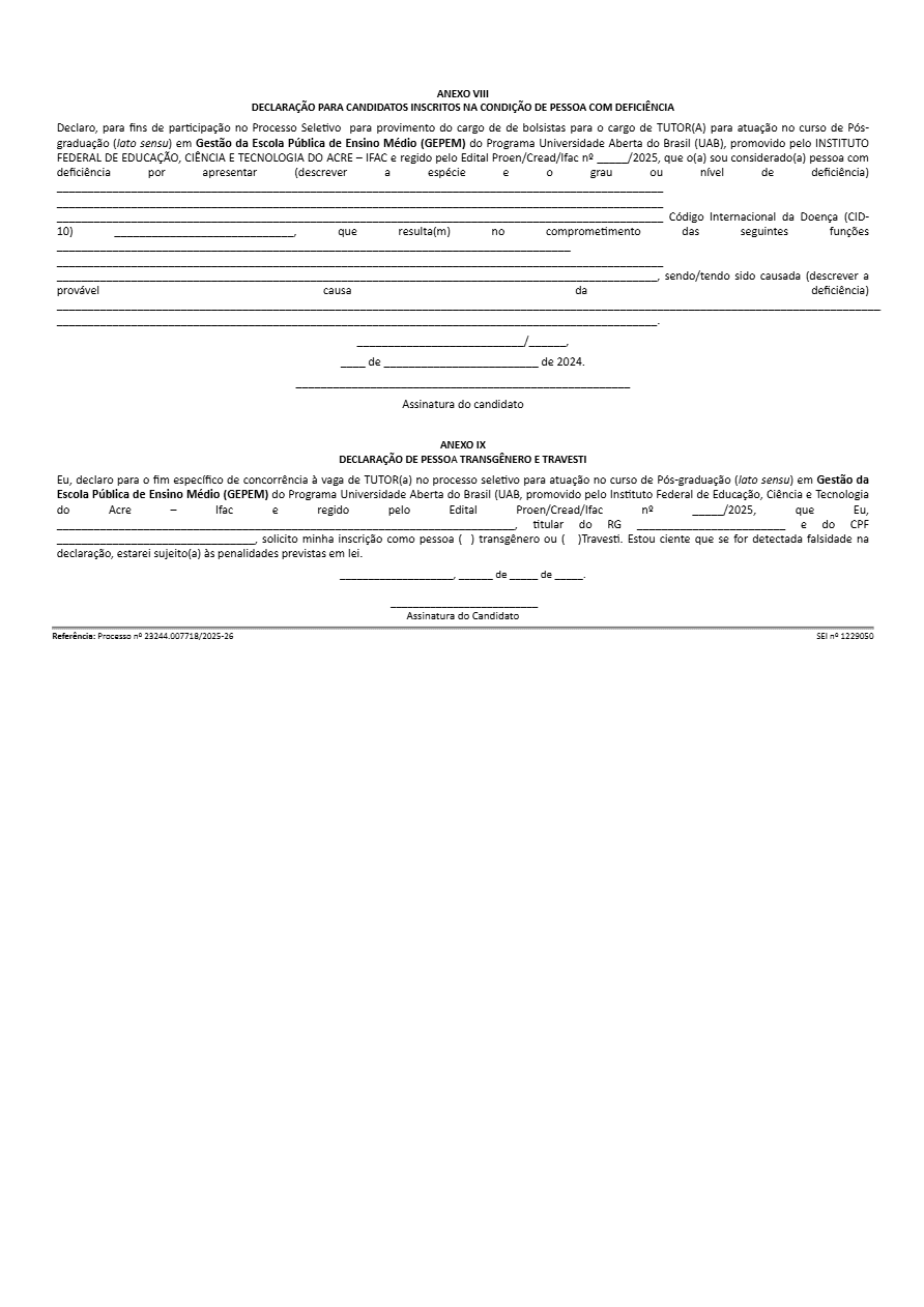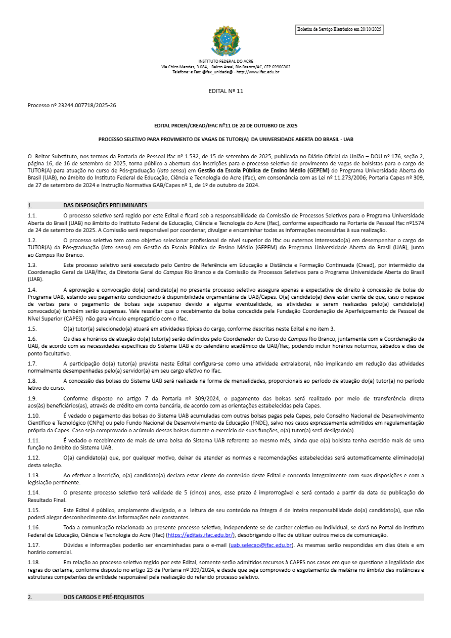 O Instituto Federal do Acre (Ifac) publicou nesta semana o Edital nº 11/2025, que abre processo seletivo para provimento de vagas de tutor(a) da Universidade Aberta do Brasil (UAB). Os profissionais selecionados irão atuar no curso de Pós-graduação Lato Sensu em Gestão da Escola Pública de Ensino Médio (GEPEM), ofertado pelo campus Rio Branco.