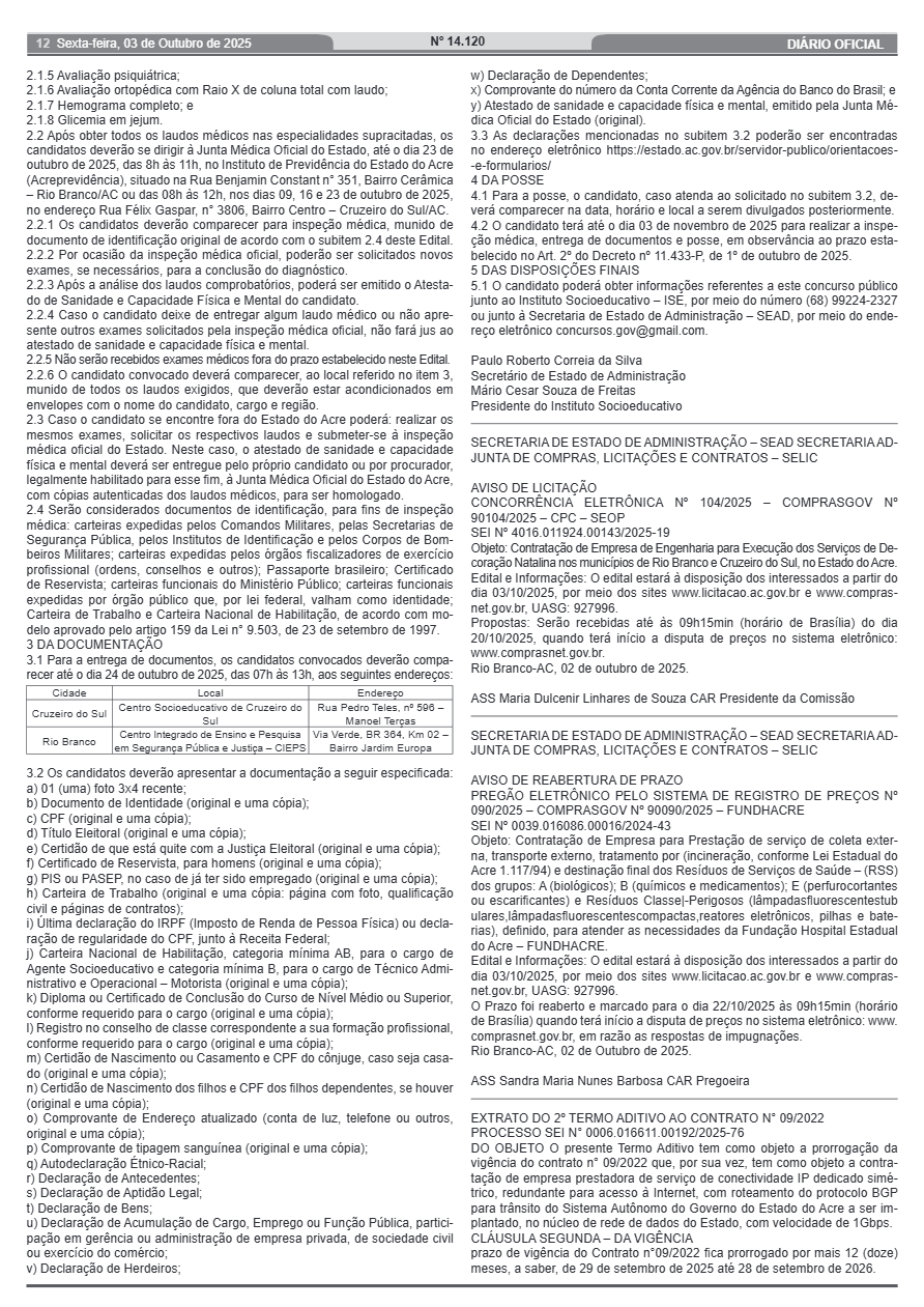 Além da inspeção médica, os convocados precisam entregar a documentação exigida, como identidade, CPF, título de eleitor, certificado de reservista (para homens), comprovante de escolaridade, registro em conselho de classe (quando aplicável), declarações funcionais e comprovante de conta no Banco do Brasil. O prazo final para a entrega é 24 de outubro de 2025, em Rio Branco, no CIEPS (Via Verde), ou em Cruzeiro do Sul, no Centro Socioeducativo.