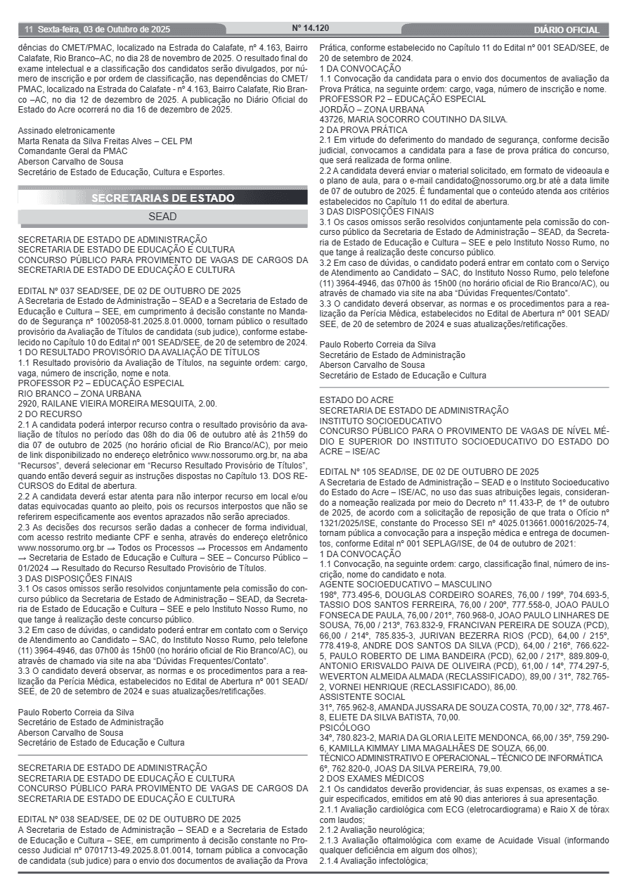 O Instituto Socioeducativo do Estado do Acre (ISE/AC), em parceria com a Secretaria de Estado de Administração (Sead), publicou nesta sexta-feira, 03, o Edital nº 105 que convoca novos aprovados no concurso público para cargos de nível médio e superior. A convocação ocorre após a publicação do Decreto nº 11.433-P, que autorizou a nomeação de candidatos para reposição de vagas.