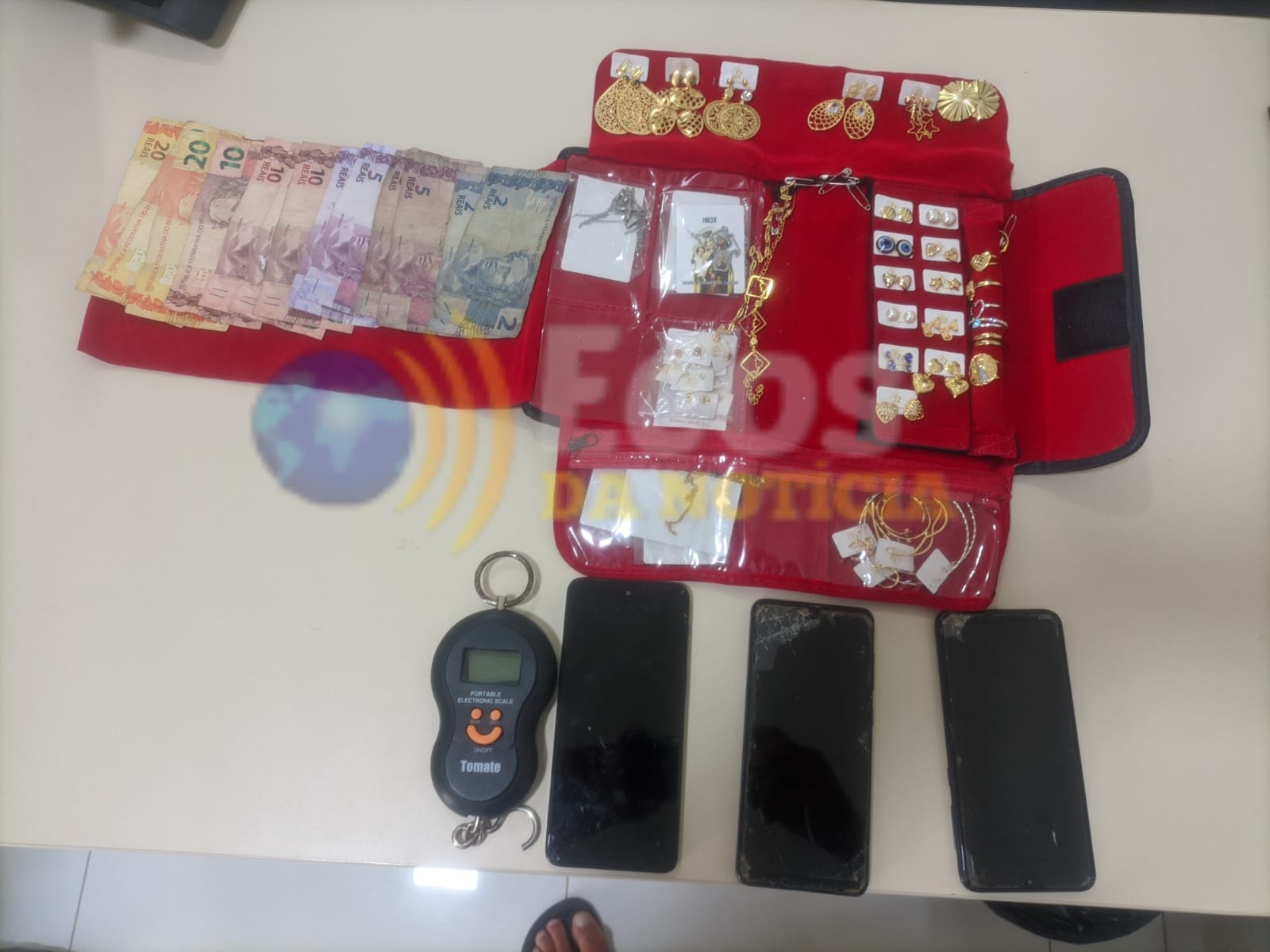 Na residência, os militares perceberam movimentação suspeita e barulhos, sugerindo que algo estava sendo escondido. Com autorização do marido, os policiais realizaram buscas e encontraram três celulares (dois Samsung e um Motorola), uma balança de precisão, um pano com várias semi-joias sem nota fiscal, uma faca tipo punhal e R$ 124 em espécie.