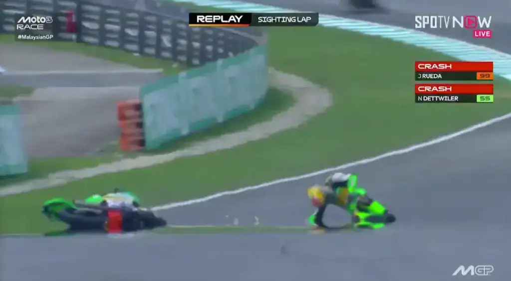 O suíço Noah Dettwiler foi levado a um hospital de Kuala Lumpur neste domingo após um grave acidente na volta de aquecimento para o GP da Malásia de Moto3, uma das categorias de acesso à MotoGP. O piloto de 20 anos sofreu múltiplas paradas cardíacas, uma fratura exposta na perna e perdeu muito sangue. Seu baço e seus pulmões também foram afetados.