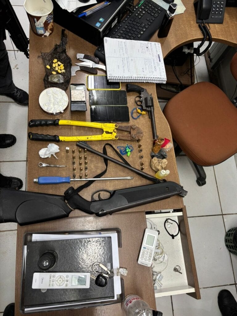Entre os materiais apreendidos, estão uma pistola 9mm, um rifle, munições de calibre .38, diversos celulares, entorpecentes (incluindo porções possivelmente de ecstasy), balanças de precisão e materiais utilizados para embalar drogas.