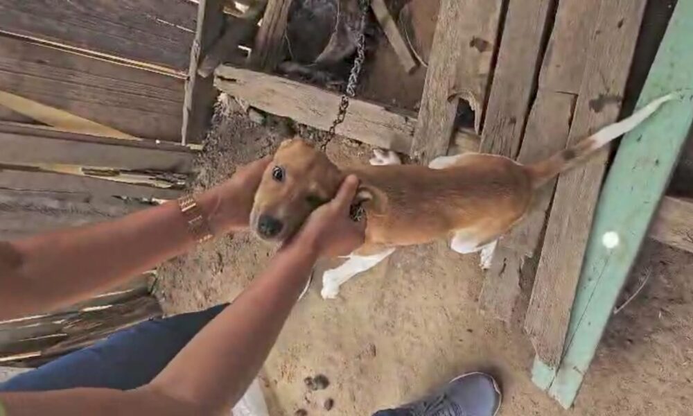 No local, os policiais e as protetoras encontraram a cadela amarrada por uma corda que causava ferimentos no pescoço, além de sem acesso a água ou alimento. O animal apresentava sinais de desnutrição e falta de cuidados básicos.