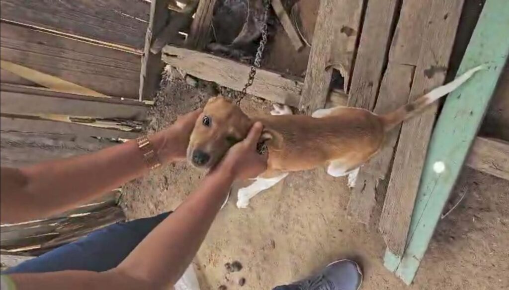 No local, os policiais e as protetoras encontraram a cadela amarrada por uma corda que causava ferimentos no pescoço, além de sem acesso a água ou alimento. O animal apresentava sinais de desnutrição e falta de cuidados básicos.