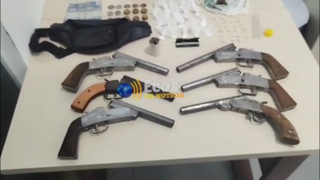 Foram apreendidos:, seis armas de fogo de fabricação caseira, quatro cartuchos calibre 28, 8,33g de substância semelhante a crack, dividida em 24 invólucros; 19,27g de substância semelhante a maconha; 21,62g de substância semelhante a cocaína, dividida em 20 invólucros; dinheiro em espécie e materiais utilizados para o tráfico.