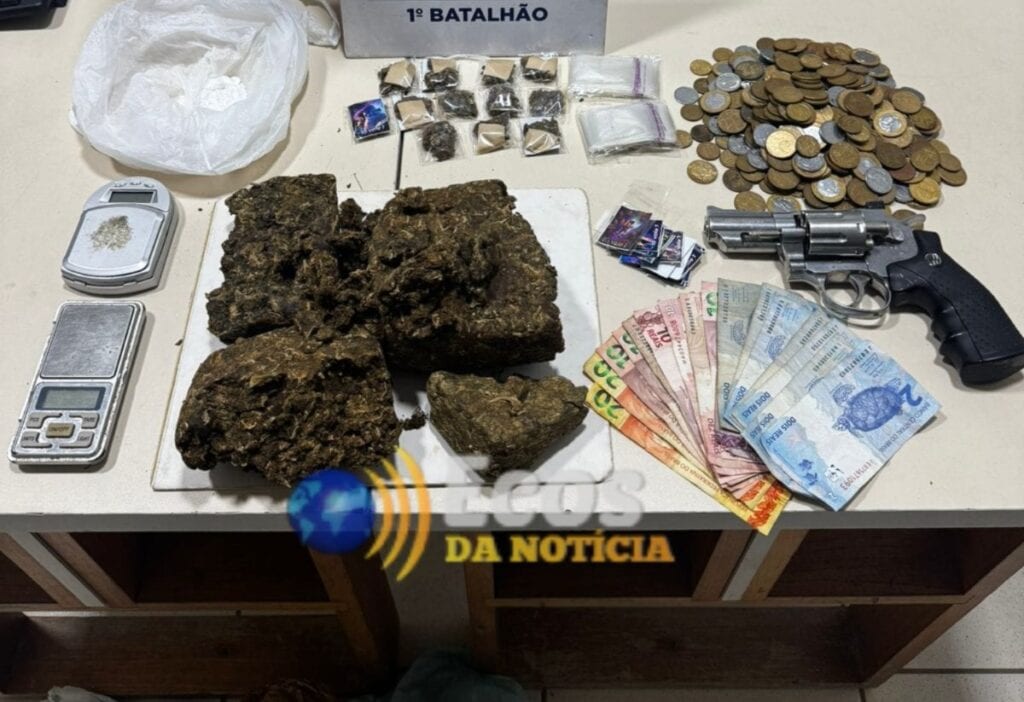 As buscas continuaram dentro da casa, onde os agentes encontraram um simulacro de arma de fogo escondido no interior de um fogão, além de mais drogas e dinheiro. No total, foram apreendidos 1,1 kg de maconha, 40 gramas de cocaína e R$ 240 em espécie.