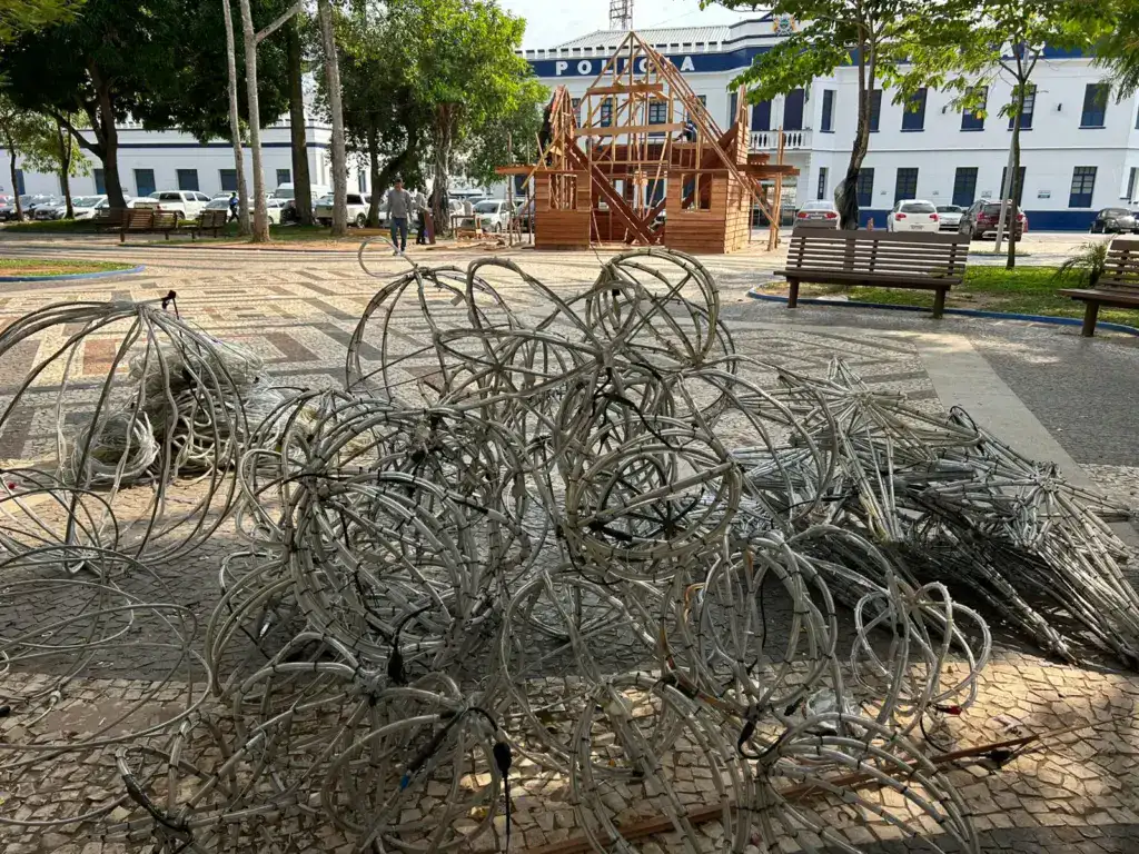 Martelos, maquitas e outros equipamentos podem ser vistos no local, onde os trabalhadores se dedicam a organizar a estrutura que receberá crianças e famílias. Quem passa pela Avenida Getúlio Vargas, próximo ao Colégio CEBRB, já percebe a movimentação e a expectativa para a chegada do Natal.