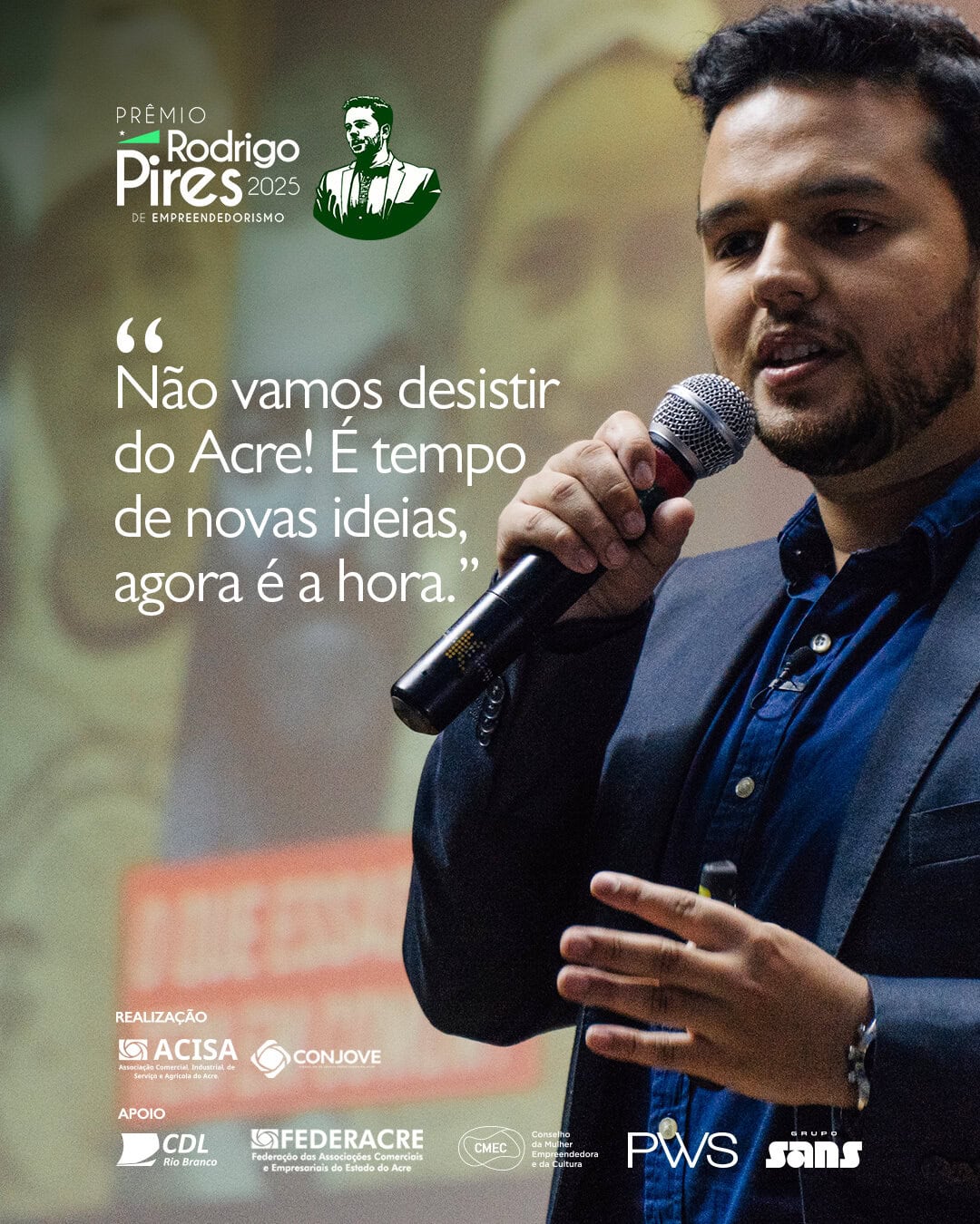O Conselho de Jovens Empresários do Acre (CONJOVE), em parceria com a ACISA, realiza nesta sexta-feira, dia 10 de outubro, às 19h, no Gran Reserva, a grande noite de celebração do Prêmio Rodrigo Pires de Empreendedorismo 2025.