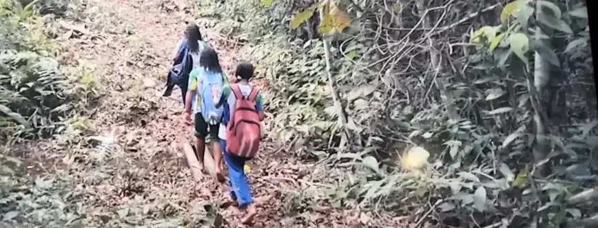 “Essa parte aqui da mata foi onde um morador escutou, ouviu a onça, o barulho que a onça faz esturrando. Ele ouviu lá de onde ele estava trabalhando, às 5 horas. Aí é a mesma hora que as alunas passam. Aí eu estudo de manhã, também venho sozinho para a escola. É muito perigoso, né? Essa parte aqui, ó, já perto de chegar no campo aonde nós vamos para a escola”, conta ele em vídeo.
