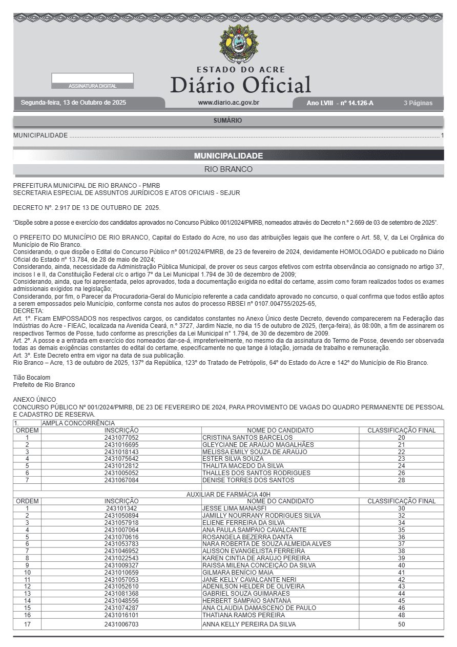 Segundo o decreto, os candidatos devem comparecer ao auditório da FIEAC para assinatura dos Termos de Posse, formalizando o ingresso no quadro de servidores municipais.