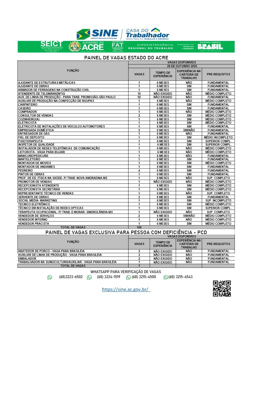 Os interessados podem obter mais informações sobre os critérios de cada vaga e acompanhar as atualizações diretamente no Sine Acre, ou por meio dos telefones: (68) 3223-6502, (68) 3224-1519, (68) 3215-4500 e (68) 3215-4543.