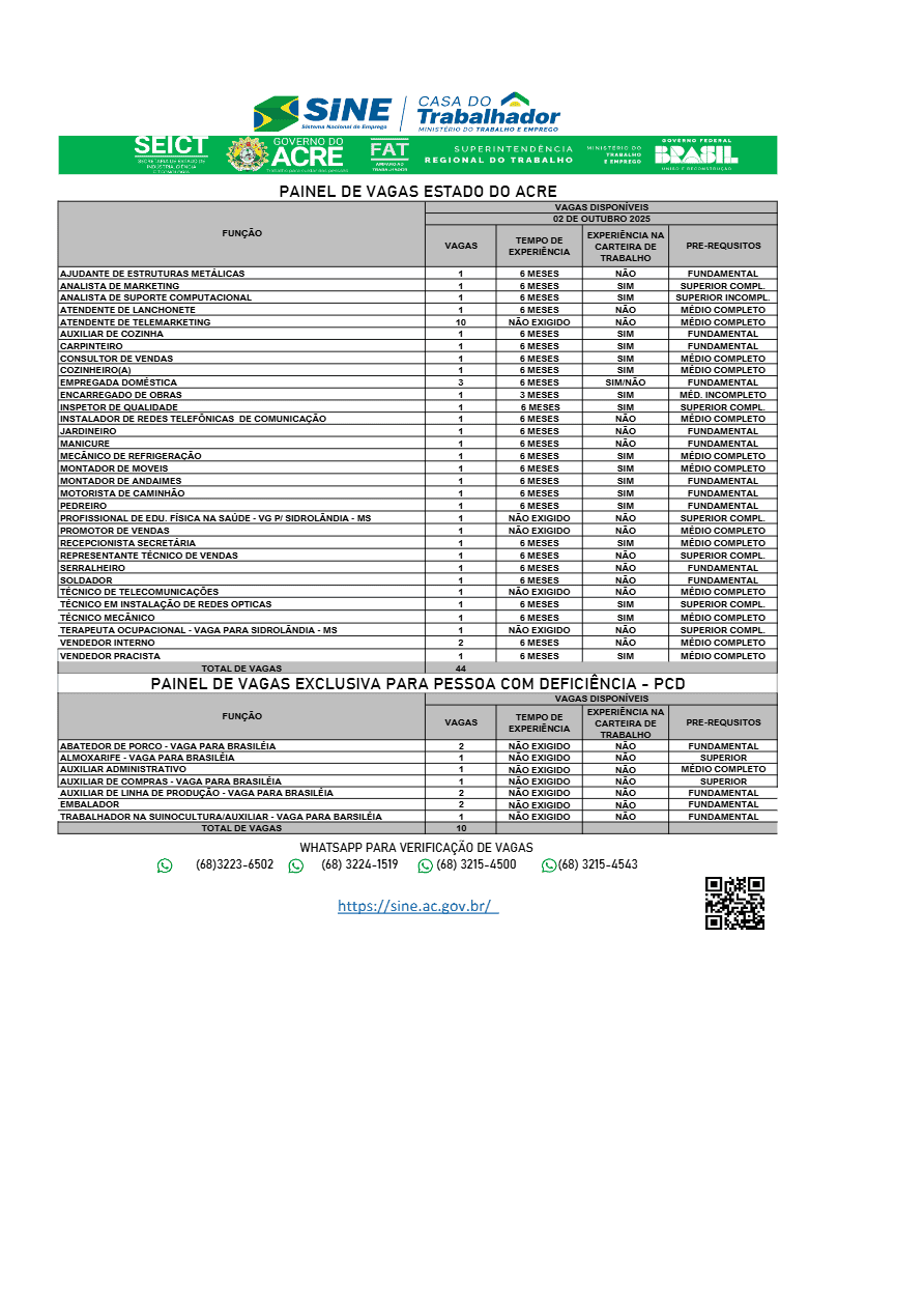 Os interessados podem obter informações detalhadas sobre requisitos, prazos e atualizações diretamente no Sine Acre ou pelos telefones: (68) 3223-6502, (68) 3224-1519, (68) 3215-4500 e (68) 3215-4543.