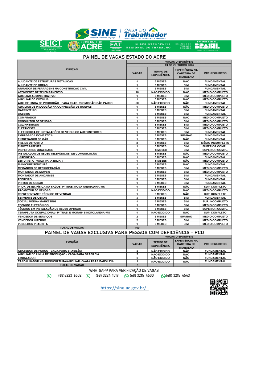 Os interessados devem procurar o Sine Acre, em Rio Branco, para obter informações sobre critérios de seleção, prazos e atualizações das oportunidades. O atendimento também pode ser realizado pelos telefones: (68) 3223-6502, (68) 3224-1519, (68) 3215-4500 e (68) 3215-4543.