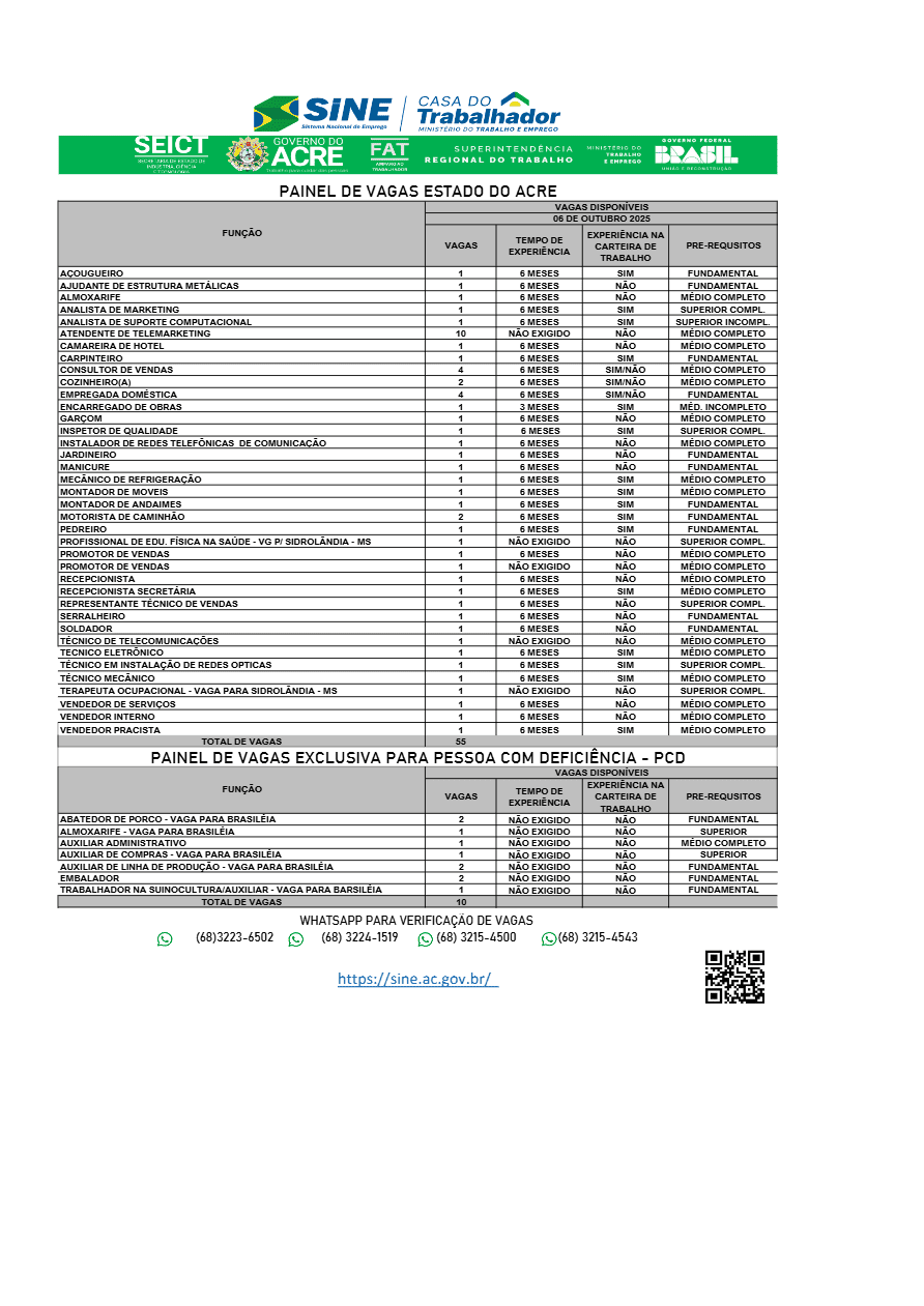 Os interessados podem obter mais informações sobre as exigências e acompanhar as atualizações diretamente no Sine Acre, ou por meio dos telefones: (68) 3223-6502, (68) 3224-1519, (68) 3215-4500 e (68) 3215-4543.