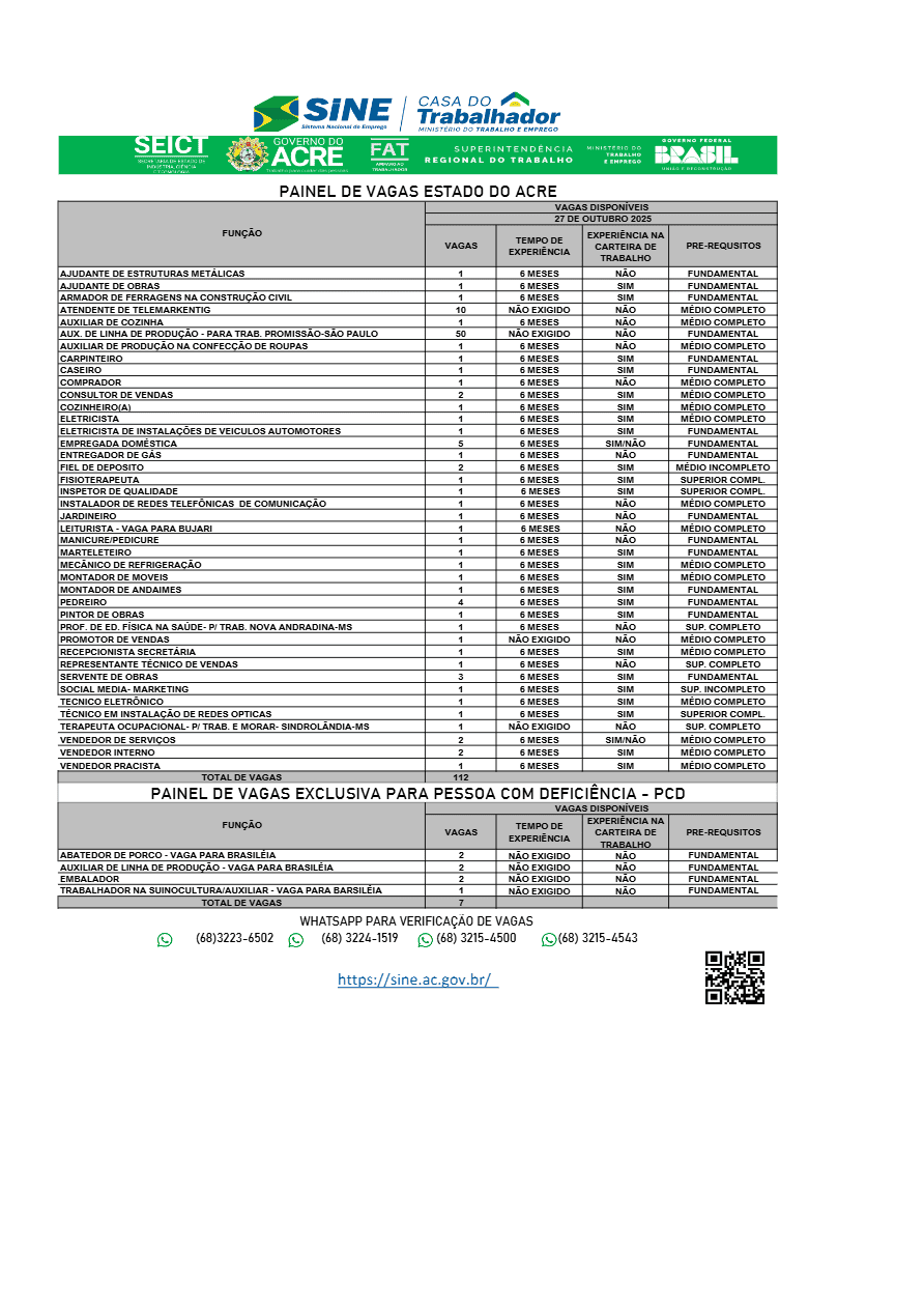 Os interessados podem obter mais informações sobre as exigências e acompanhar as atualizações diretamente no Sine Acre, ou pelos telefones (68) 3223-6502, (68) 3224-1519, (68) 3215-4500 e (68) 3215-4543.